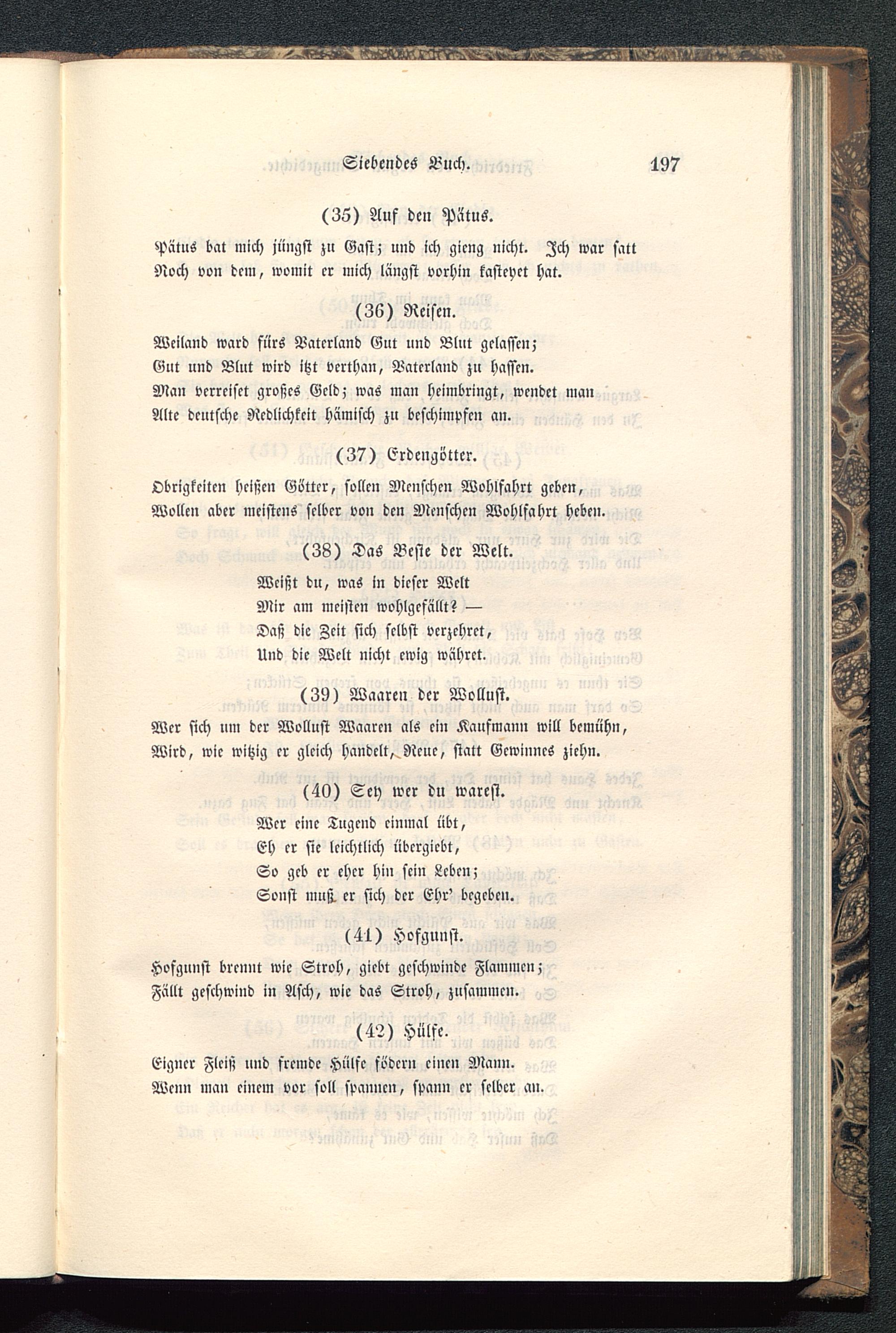 Weiland ward fürs Vaterland Gut und Blut gelassen;Gut und Blut wird itzt verthan, Baterland zu hassen.Man verreiset großes Geld; was man heimbringt, wendet manAlte deutsche Redlichkeit hämisch zu beschimpfen an.