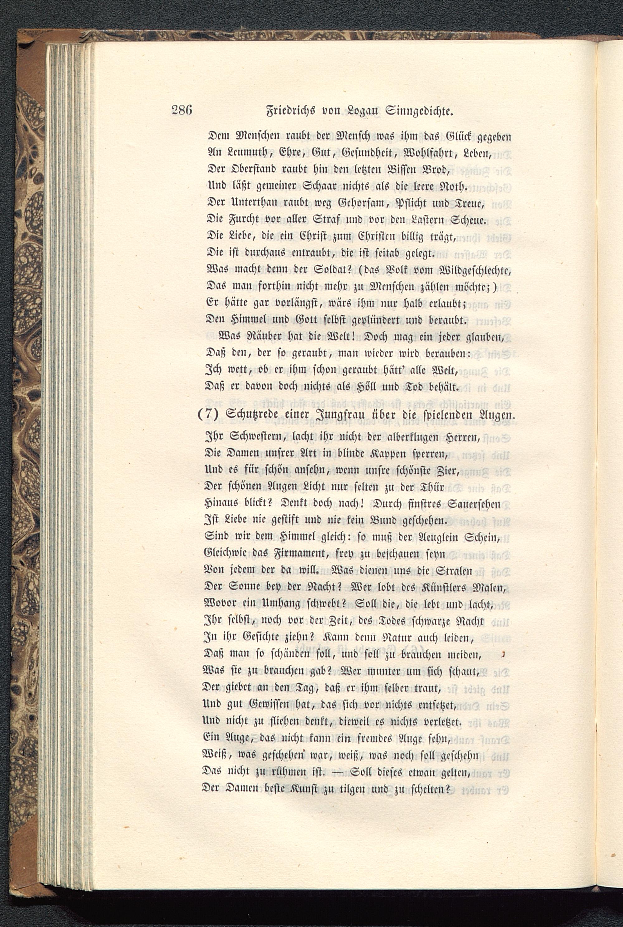 Dem Menschen raubt dcr Mensch was ihm das Gluck gegebenAn Lcnmuth, Ehre, Gut, Gesundheit, Wohlfahrt, Leben,Der Oberstand raubt hin den letzten Bissen Brod,Und laßt gemeiner Schaar nichts als die leere Noth.Dcr Unterthan raubt weg Gehorsam, Pflicht und Treue,Die Furcht vor aller Straf und vor den Lastern Scheue.Die Liebe, die ein Christ zum Christen billig tragt,Die ist durchaus entraubt, die ist seitab gelegt.Was macht den» dcr Soldat? (das Bolk vom Wildgcschlcchte,Das man forthin nicht mchr zu Mcnschcn zählen möchte;)Er hätte gar vorlängst, wärs ihm nur halb erlaubt;Den Himmel und Gott selbst geplündert und beraubt.