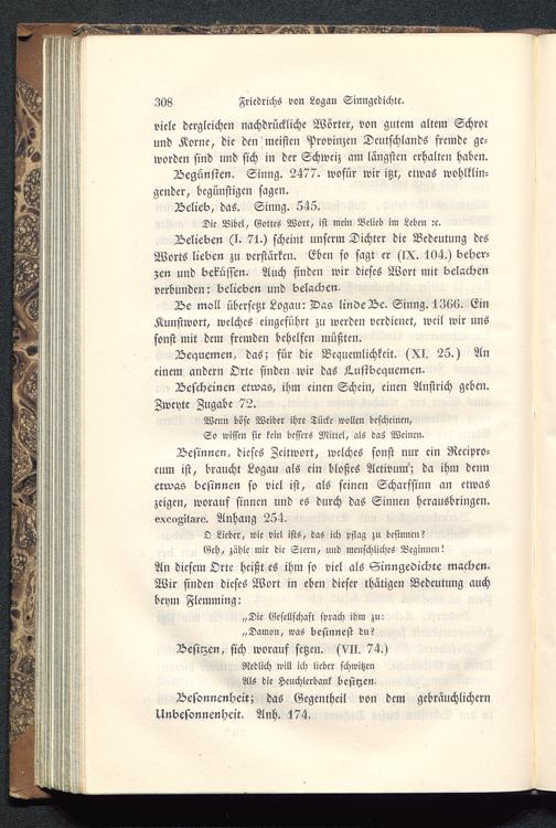 Besinnen, dieses Zeitwort, welches sonst nur ein Rccipro-cum ist, braucht Logau als ein bloßes Activum; da ihm dennerrvas besinnen so viel ist, als scincn Scharfsinn an etwaszeigen, worauf sinnen und es durch das Sinnen herausbringen.oxenFitsro. Anhang 264.