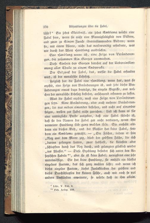 Was die Fabcl crzchlt, muß cinc Folge von Veränderun-gen seyn. Eine Vcrändcrung, odcr auch mchrcrc Veränderun-gen, die nur neben einander bestehen, und nicht auf einanderfolgen, wollen zur Fabcl nicht zureichen. Und ich kann cs fürcinc imtricglichc Probc ausgeben, daß cinc Fabcl schlccht ist,daß sie dcn Namcn dcr Fabcl gar nicht vcrdienct, wcnn ihrevcrmcintc Handlung sich ganz mahlen läßt. Sie cnlhält als-denn cin bloßcs Bild, und dcr Mablcr hat keine Fabcl, son-dern ein Emblema gemahlt. — „Ein Fischer, indem er sein„Netz aus dem Mccrc zog, blieb dcr grossem Fische, die sich„darinn gefangen hatten, zwar habhaft, die kleinsten aber„schlüpften durch das Netz durch, und gelangte» glücklich wieder„ins Wasser." — Diese Erzchlung befindet sich unter dcn Ac-sopischcn Fabeln abcr sie ist kcinc Fabcl; wenigstens cinc sehrmittclmcisslgc. Sie hat kcinc Handlung, sic enthält cin blosseseinzelnes Factum, das sich ganz mahlen läßt; und wcnn ichdieses einzelne Factum, dieses Zurückbleiben dcr grösscrn unddieses Durchschlüpfen dcr kleinen Fische, auch mit noch so vielandern Umständen erweiterte, so würde doch in ihm allein,