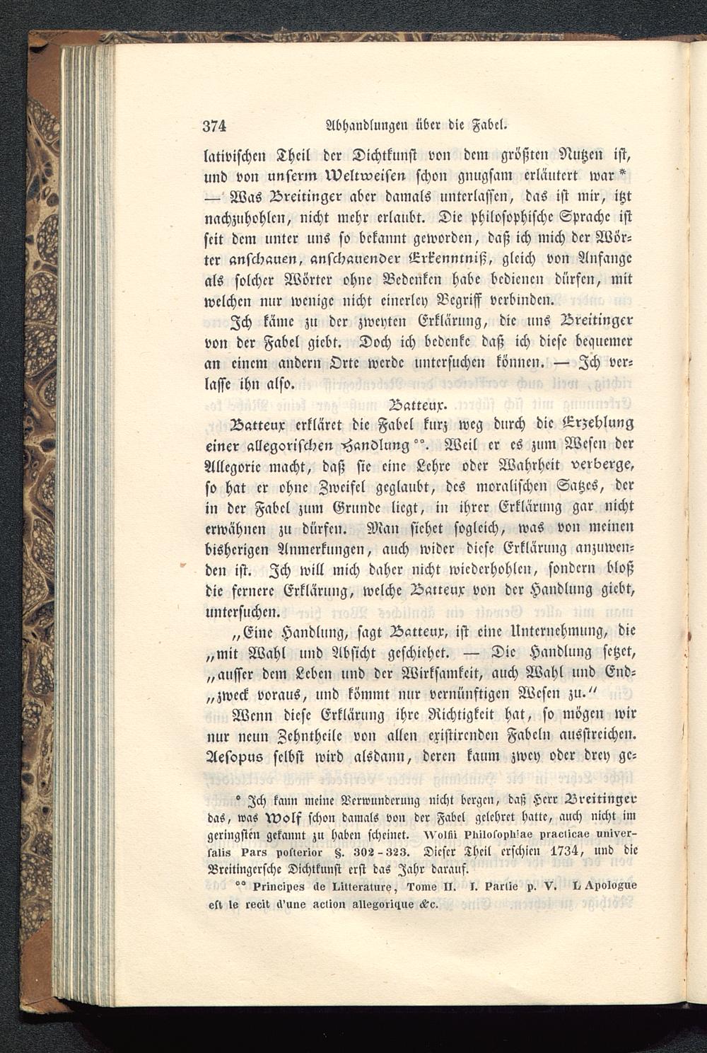 ° Ich kann meine Verwunderung nicht bergen, das; Herr ZZreitingerdas, was Wolf schon damals von der Fabel gclchret hatte, auch nicht imgeringsten gekannt zu haben scheinet. ^Voitii Pluto so M-re pr->e>i<:ile milve»siUi» ?ars potterlor Z. 3V2-323. Dieser Theil erschien 1734, und dieBreitingcrschc Dichtkunst erst das Jahr darauf.