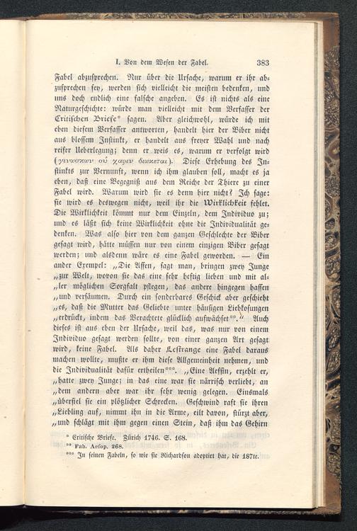 Fabel abzusprechen. Nur über die Ursache, warum er ihr ab-zusprechen sey, werden sich vielleicht die meisten bedenken, unduns doch endlich eine falsche angeben. Es ist nichts als eineNaturgeschichte: würde man vielleicht mit dem Verfasser derLritischcn Briefe" sagen. Aber gleichwohl, würde ich miteben diesem Verfasser antworten, handelt hier der Biber nichtaus blossem Instinkt, er handelt aus freyer Wahl und nachreifer Uebcrlcgung; denn er weis es, warum er verfolgt wird^ti'uio'x(t>v x^?^ <5lk>>cs?oi<,). Diese Erhebung des In-stinkts zur Vernunft, wenn ich ihm glauben soll, macht es jaeben, daß eine Bcgcgniß aus dem Reiche der Thiere zu einerFabel wird. Warum wird sie es denn hier nicht? Ich sage:sie wird es deswegen nicht, weil ihr die Wirklichkeit fehlet.Die Wirklichkeit kömmt nur dem Einzeln, dem Zndividuo zu;und es läßt sich keine Wirklichkeit ohne die Individualität ge-denken. Was also hier von dem ganzen Geschlechte der Bibergesagt wird, halte müssen nur von einem einzigen Biber gesagtwerden; und alsdcnn wäre es eine Fabel geworden. — Einander Exempel: „Die Assen, sagt man, bringen zwey Zunge„zur Welt, wovon sie das eine sehr heftig lieben und mit al-„ler möglichen Sorgfalt Pflegen, das andere hingegen hassen„und versäumen. Durch ein sonderbares Geschick aber geschieht„es, daß die Mutter das Geliebte unter häufigen Liebkosungen„erdrückt, indem das Verachtete glücklich aufwachset"*." Auchdieses ist aus eben der Ursache, weil das, was nur von einemZndividuo gesagt werden sollte, von einer ganzen Art gesagtwird, keine Fabel. Als daher L.cstrange eine Fabel darausmachen wollte, mußte er ihm diese Allgemeinheit nehmen, unddie Individualität dafür ertheilen""". „Eine Acffin, erzchlt er,„hatte zwey Zunge; in das eine war sie närrisch verliebt, an„dem andern aber war ihr sehr wenig gelegen. Einsmals„überfiel sie ein plötzlicher Schrecken. Geschwind rast sie ihren„Liebling auf, nimmt ihn in die Arme, eilt davon, stürzt aber,„und schlägt mit ihm gegen einen Stein, daß ihm das Gehirn