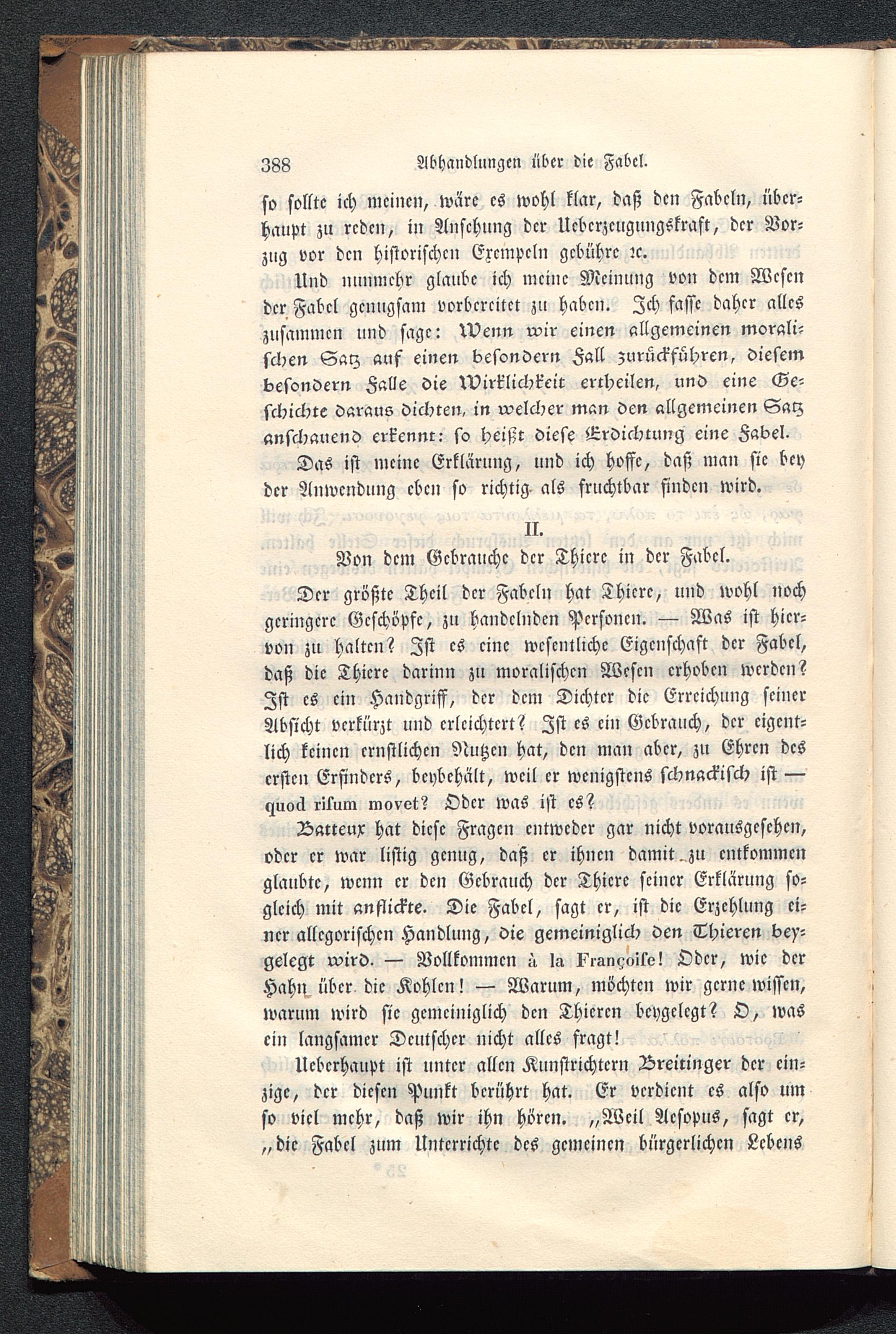 Der größte Theil der Fabeln hat Thiere, und wohl nochgeringere Geschöpfe, zu handelnden Personen. — Was ist hier-von zu halten? Ist es eine wesentliche Eigenschaft der Fabel,daß die Thiere darinn zu moralischen Wesen erhoben werden?Ist es ein Handgriff, der dem Dichter die Erreichung seinerAbsicht verkürzt und erleichtert? Ist es ein Gebrauch, der eigent-lich keinen ernstlichen Nutzen hat, den man aber, zu Ehren desersten Erfinders, beybchält, weil er wenigstens schnackisch ist —nuoä ritum movc-t? Oder was ist es?