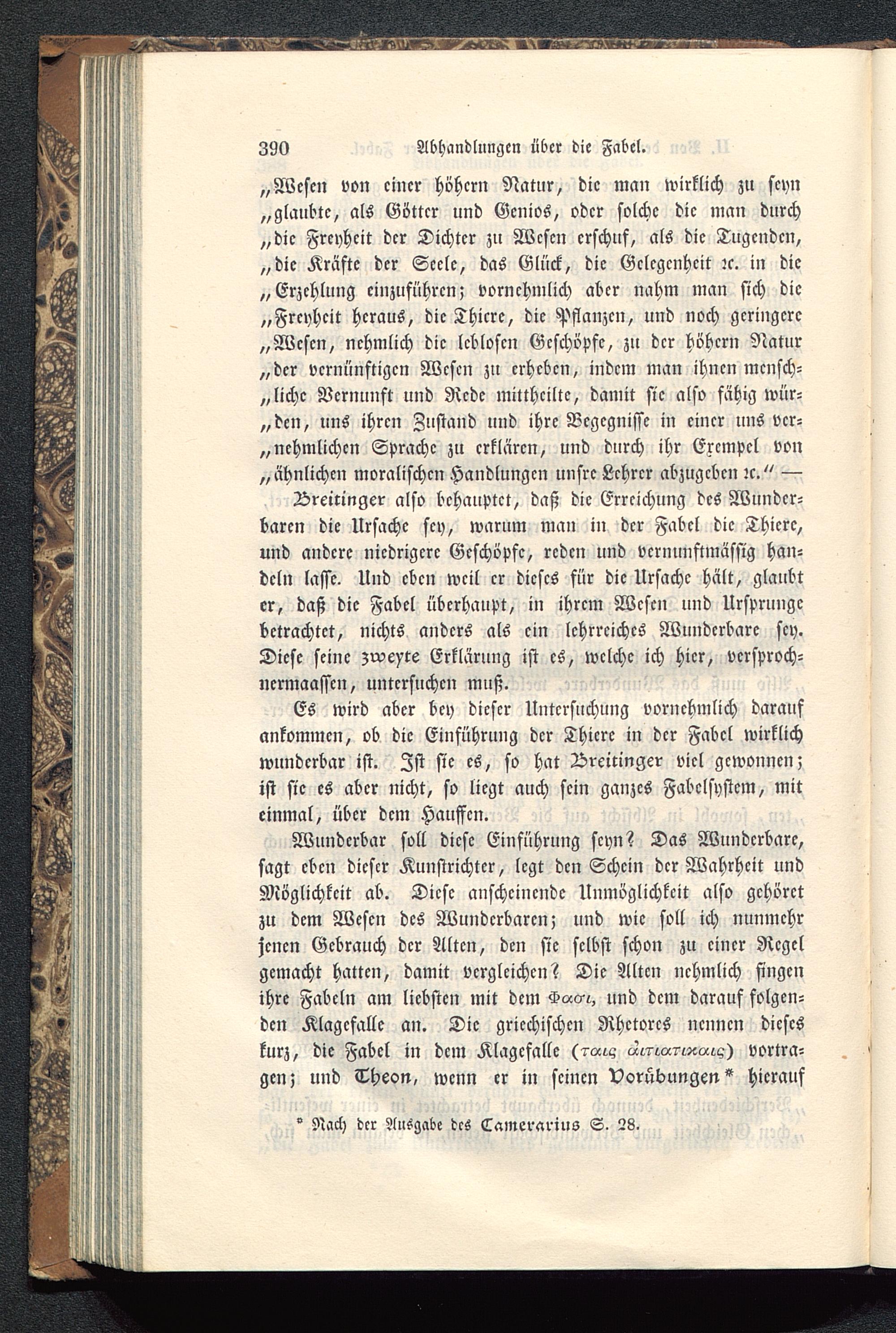 Dreiringer also behauptet, daß die Erreichung des Wunder-baren die Ursache sey, warum man in der Fabel die Thiere,und andere niedrigere Geschöpfe, reden und vernunftmässig han-deln lasse. Und eben weil er dieses für die Ursache hält, glaubter, daß die Fabel überhaupt, in ihrem Wesen und Ursprüngebetrachtet, nichts anders als ein lehrreiches Wunderbare sey.Diese seine zrveyre Erklärung ist es, welche ich hier, versproch-ncrmaasscn, untersuchen muß.