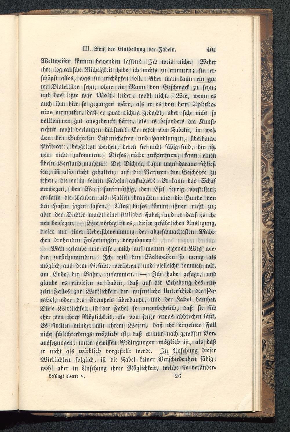 Man erlaube mir also, mich auf meinen eigenen Weg wie-der zurückzuwenden. Zch will den Wcltweiscn so wenig alsmöglich aus dcm Gesichte verlieren; und vielleicht kommen wir,am Ende der Bahn, zusammen. — Zch habe gesagt, undglaube es erwiesen zu haben, daß auf der Erhebung des ein-zeln Falles zur Wirklichkeit der wesentliche Unterschied der Pa-rabel, oder des Ercmpcls überhaupt, und der Fabel beruhet.Diese Wirklichkeit ist der Fabel so unentbehrlich, daß sie sicheher von ihrer Möglichkeit, als von jener etwas abbrechen läßt.Es streitet minder mit ihrem Wesen, daß ihr einzelner Fallnicht schlechterdings möglich ist, daß er nur nach gewissen Vor-aussetzungen, unter gewissen Bedingungen möglich ist, als daßer nicht als wirklich vorgestellt werde. Zn Ansehung dieserWirklichkeit folglich, ist die Fabel keiner Verschiedenheit sähig;wohl aber in Ansehung ihrer Möglichkeit, welche sie vcrändcr-Lessmgs Werke V. 26