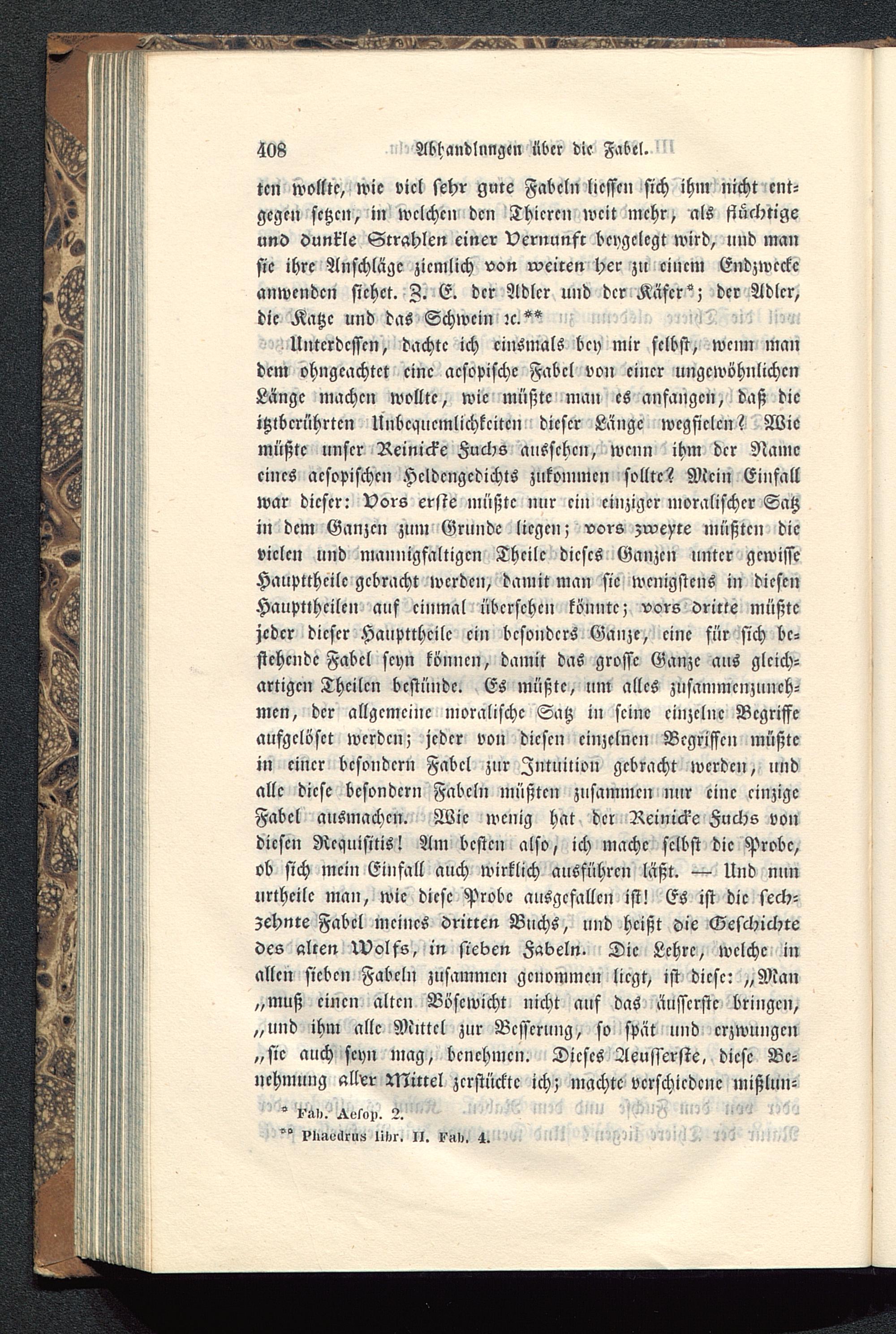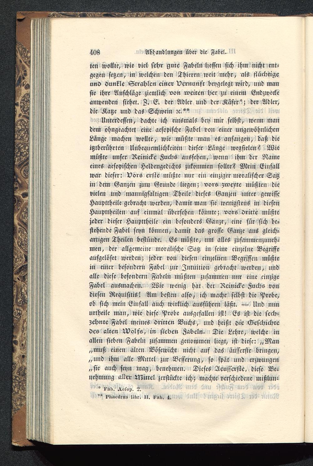 Unterdessen, dachte ich cinsmals bey mir selbst, wenn mandem vhngeachtct eine acsopische Fabel von einer ungewöhnlichenLänge machen wollte, wie müßte man es anfangen, daß dieitztbcrührten Unbequemlichkeiten dieser Länge wegfielen? Wiemüßte unser Reinickc Fuchs aussehen, wenn ihm der Nameeines acsopischcn Heldengedichts zukommen sollte? Mein Einfallwar dieser: Vors erste müßte mir ein einziger moralischer Satzin dem Ganzen zum Grunde liegen; vors zroeyte müßten dievielen und mannigfaltigen Theile dieses Ganzen unter gewisseHauptthcile gebracht werden, damit man sie wenigstens in diesenHauptthcilen auf einmal übersehen könnte; vors dritte müßtejeder dieser Hauptthcile ein besonders Ganze, eine für sich be-stehende Fabel seyn können, damit das grosse Ganze aus gleich-artigen Theilen bestünde. Es müßte, um alles zusammenzuneh-men, der allgemeine moralische Satz in seine einzelne Begriffeaufgelöset werden; jeder von diesen einzelnen Begriffen müßtein einer besondern Fabel zur Intuition gebracht werden, undalle diese besondern Fabeln müßten zusammen nur eine einzigeFabel ausmachen. Wie wenig hat der Rcinici'e Fuchs vondiesen Requisitis! Am besten also, ich mache selbst die Probe,ob sich mein Einfall auch wirklich ausführen läßt. — Und nunurtheile man, wie diese Probe ausgefallen ist! Es ist die sech-zehnte Fabel meines dritten Buchs, und heißt die Geschichtedes «Iren Ivolfs, in sieben Fabeln. Die Lehre, welche inallen sieben Fabeln zusammen genommen liegt, ist diese: „Man„muß einen alten Vöscwicht nicht auf das äusserste bringen,„und ihm alle Mittel zur Besserung, so spät und erzwungen„sie auch seyn mag, benehmen. Dieses Aeusserste, diese Bc-nchmung alkr Mittel zcrstückte ich; machte verschiedene mißlun-° r-u.. ?.