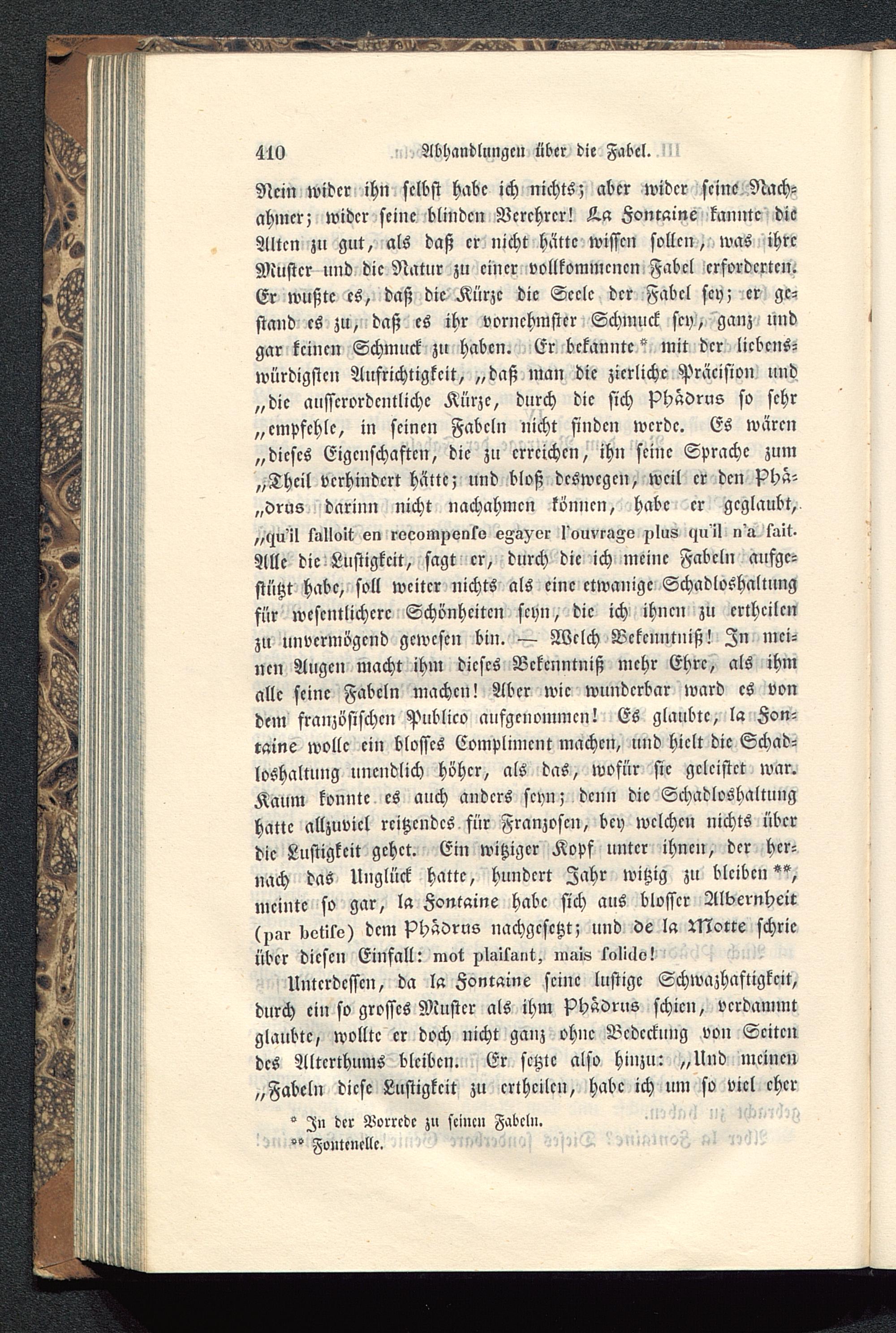 Unterdessen, da la Fontaine seine lustige Schwazhaftigkcit,durch ein so grosses Muster als ihm PhaSrus schien, verdammtglaubte, wollte er doch nicht ganz ohne Bedeckung von Seitendes Alterthums bleiben. Er setzte also hinzu: „Und meinen„Fabeln diese Lustigkeit zu ertheilen, habe ich um so viel eher