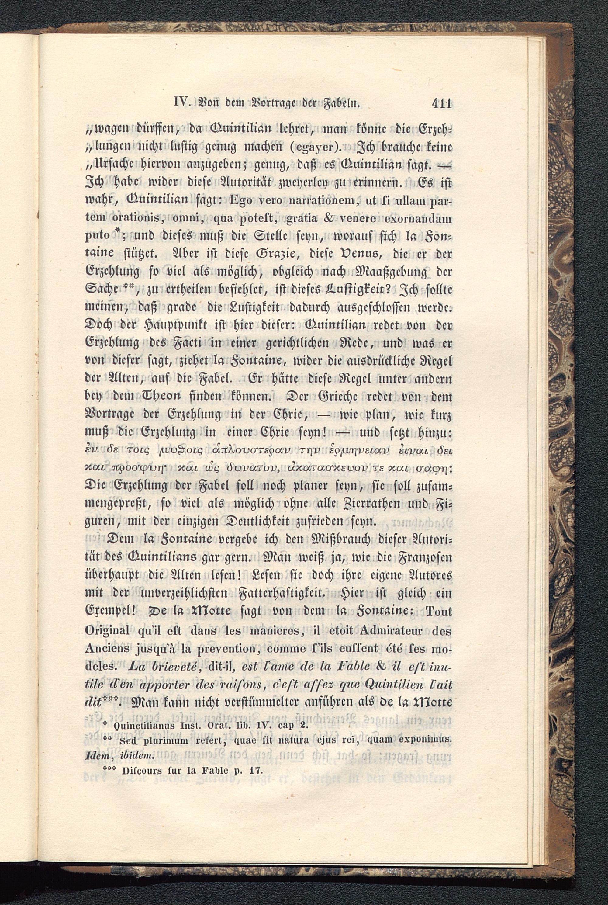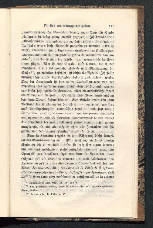 „wagen dürsten, da (lwintilian lehret, man könne die Erzch-„liingcn nicht lustig genug machen (oA-ivvr). Zch brauche keine„Ursache hiervon anzugeben, genug, daß es Äuintilian sagt. —Zch habe wider diese Autorität zwcycrlcy zu erinnern. Es istwahr, (üuintllian sagt: IZgo voro niurationom, ut 1i u»am nar-toiu orationis, omni, lni» potett, Aratia A vvnerv vxninaliclamnuto und dieses muß die Stelle seyn, worauf sich la Fon-taine stützet. Aber ist diese Grazie, diese Venus, die er derErzchlung so viel als möglich, obgleich nach Maaßgcbung derSache zu ertheilen bcfichlct, ist dieses Lustigkeit? Zch solltemeinen, daß grade die Lustigkeit dadurch ausgeschlossen werde.Doch der Hauptpunkt ist hier dieser: (Unintilian redet von derErzchlung dcs Facti in einer gerichtlichen Rede, und was ervon dieser sagt, ziehet la Fontaine, wider die ausdrückliche Regelder Alten, auf die Fabel. Er hätte diese Regel unter andernbey dem Theon finden können. Der Grieche redet von demAortragc der Erzchlung in der Chric, — wie plan, wie kurzmuß die Erzchlung in einer Chrie seyn! — und setzt hinzu: