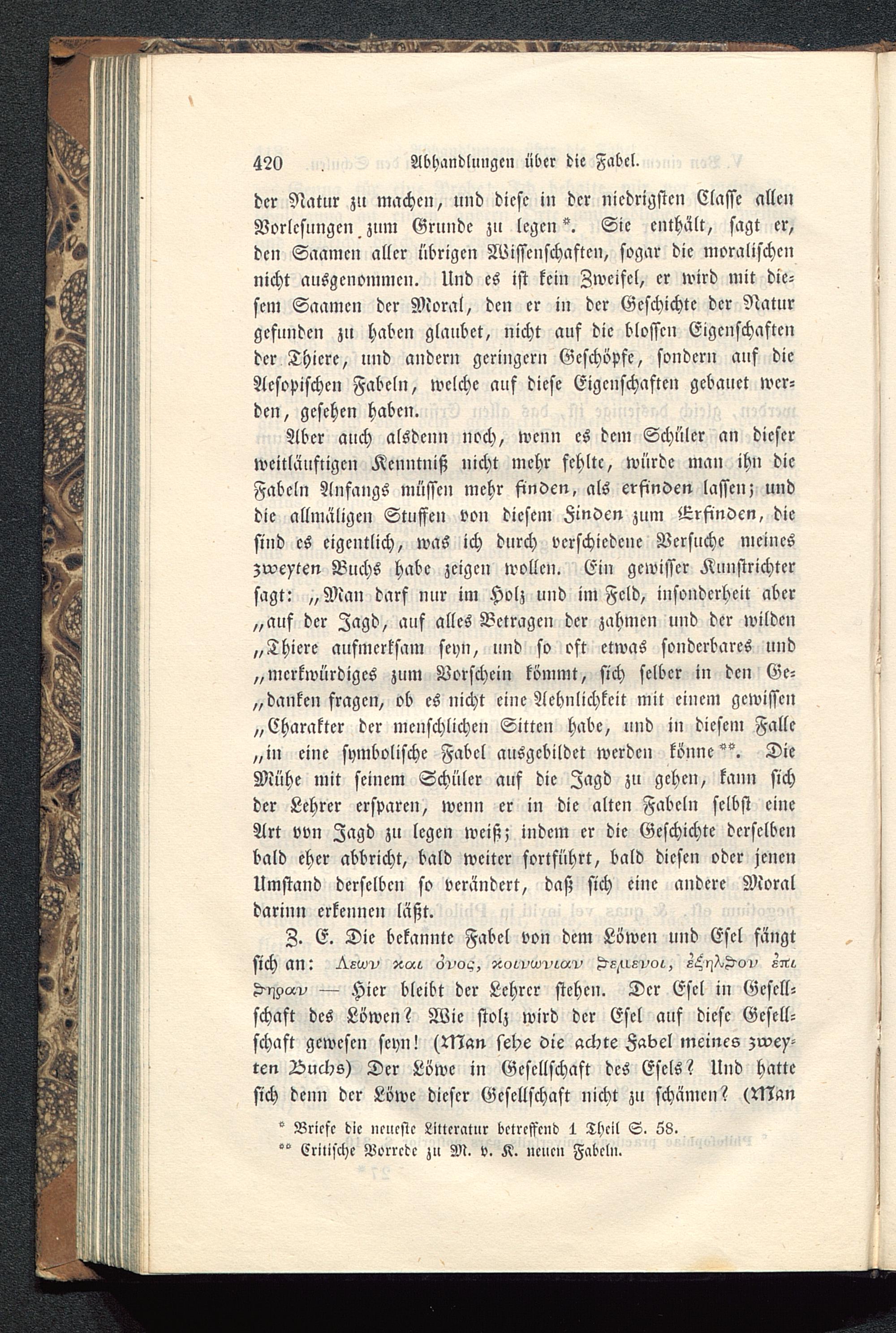 — Hier bleibt der Lehrer stehen. Der Esel in Gesell-schaft des Löwen? Wie stolz wird der Esel auf diese Gesell-schaft gewesen seyn! (Man sehe die achte Fabel meines zwey-ten Äuchs) Der Löwe in Gesellschaft des Esels? Und hattesich denn der Löwe dieser Gesellschaft nicht zu schämen? (Man