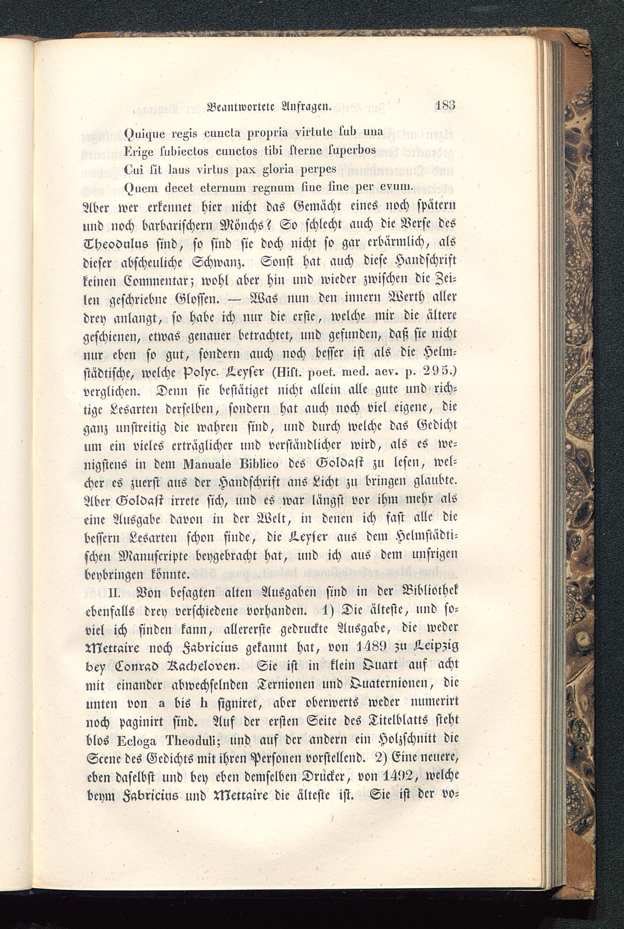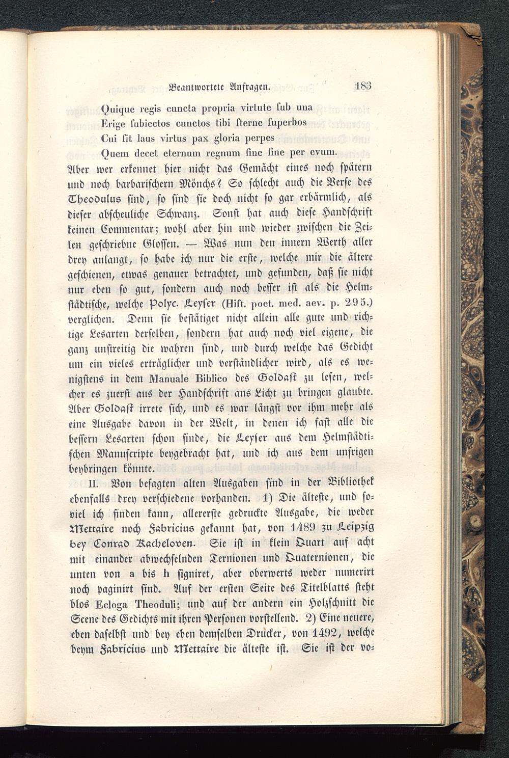 (^uitjiio IPUS euuota proprii» viilutv l'ul^ uuaIrrige l'uliiectos cuueto8 tilii ktoinc l'aperliost>ui lit luu» virtus pax gloiiu pvi^es<^uom cloeet etvl'ouin rvAnum lliiv liiie per ovuiu.Aber wer erkennet hier nicht das Gemacht eines noch späternund noch barbarischem Mönchs? So schlecht auch die Nerse desThcodulus sind, so sind sie doch nicht so gar erbärmlich, alsdieser abscheuliche Schwanz. Sonst hat auch diese Handschriftkeinen Commentar; wohl aber hin und wieder zwischen die Zei-len geschricbne Glossen. — Was nun den innern Werth allerdrey anlangt, so habe ich nur die erste, welche mir die älteregeschienen, etwas genauer betrachtet, und gefunden, daß sie nichtnur eben so gut, sondern auch noch besser ist als die Helm-städtische, welche Polyc. -L.eyscr (gilt. poet. mecl. aev. p. 29 5.)verglichen. Denn sie bestätiget nicht allein alle gute und rich-tige Lesarten derselben, sondern hat auch noch viel eigene, dieganz unstreitig die wahren sind, und durch welche das Gedichtum ein vieles erträglicher und verständlicher wird, als es we-nigstens in dem U-mualo Lidlieo des Goldast zu lesen, wel-cher es zuerst aus der Handschrift ans Licht zu bringen glaubte.Aber Goldast irrcte sich, und es war längst vor ihm mehr alseine Ausgabe davon in der Welt, in denen ich fast alle diebessern Lesarten schon finde, die Geyser aus dem Hclmstädti-schcn Manuscnpte beygebracht hat, und ich aus dem unsrigcnbeybringen könnte.