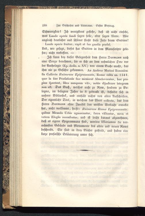 Ich kann bey dieser Gelegenheit dem Herrn Zöurmann nocheine Sorge benehmen, die er sich an dem nehmlichen Orte vorder Anthologie (L». cloclic. n. XV.) von einem Buche macht, dasihm nie zu Gesichte gekommen, ^n ^nclrese lUari-mi Lononlen-kis tÄ^eo^tt ^K?«»tt» ?t?» ^?/A?n?^?/«akK, liomw eclita an. 1341.l^uiv in ünv prsetationis luu: momorat ^Imeloveenius, Iiuo r^ro-plus Ineetent, liliro nun,jui>m vitn, noüis clijuclieare intoziumiion ett. Das Buch, welches nicht zu Rom, sondern zu Bo-logna , im besagten Zahre in 8 gedruckt ist, befindet sich inunserer Bibliothek, und enthält nichts von alten Aufschriften.Der eigentliche Titel, in welchem das Wort collecw, das demHerrn Burmann ohne Zweifel den meisten Verdacht erweckethat, nicht vorkömmt, heißt: H?«',^,-?«/- Hm»« ^p/A,-«»/,««^.-«julbus Nirantla, Urdis aAnoseuntur, taera vititantur, vova etvetera LloZii« recenfentur; und ist leicht daraus abzunehmen,daß es eigene Epigrammata sind, worinn Marianus die vor-nehmsten Gebäude und Monumente des alten und neuen Romsbeschreibt. Sie sind in drey Bücher getheilt, und haben einekurze prosaische Erläuterung untcr sich.