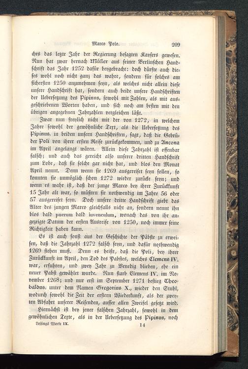 Zwar nun freylich nicht mit der von 1272, in welchemJahre sowohl der gewöhnliche Text, als die Ucbersctzung desPipinus, in beiden unsern Handschriften, sagt, daß die Gebrü-der Poli von ihrer ersten Reise zurückgekommen, und zu Ancona im April angelangt wären. Allein diese Zahrzahl ist offenbarfalsch; und auch das gereicht also unserer dritten Handschriftzum Lobe, daß sie solche gar nicht hat, und blos den MonatApril nennt. Denn wenn sie 1269 ausgerciser seyn sollen, sokonnten sie unmöglich schon 1272 wieder zurücke seyn; undwenn es wahr ist, daß der junge Marco bey ihrer Zurückkunst16 Zahr alt war, so müßten sie nothwendig im Zahre 66 oder67 ausgerciser seyn. Doch unsere dritte Handschrift giebt dasAlter dcs jungen Marco gleichfalls nicht an, sondern nennt ihnblos bald puerum bald iuvvnculum, wonach das von ihr an-gezeigte Datum der ersten Ausreise von 1250, noch immer seineRichtigkeit haben kann.