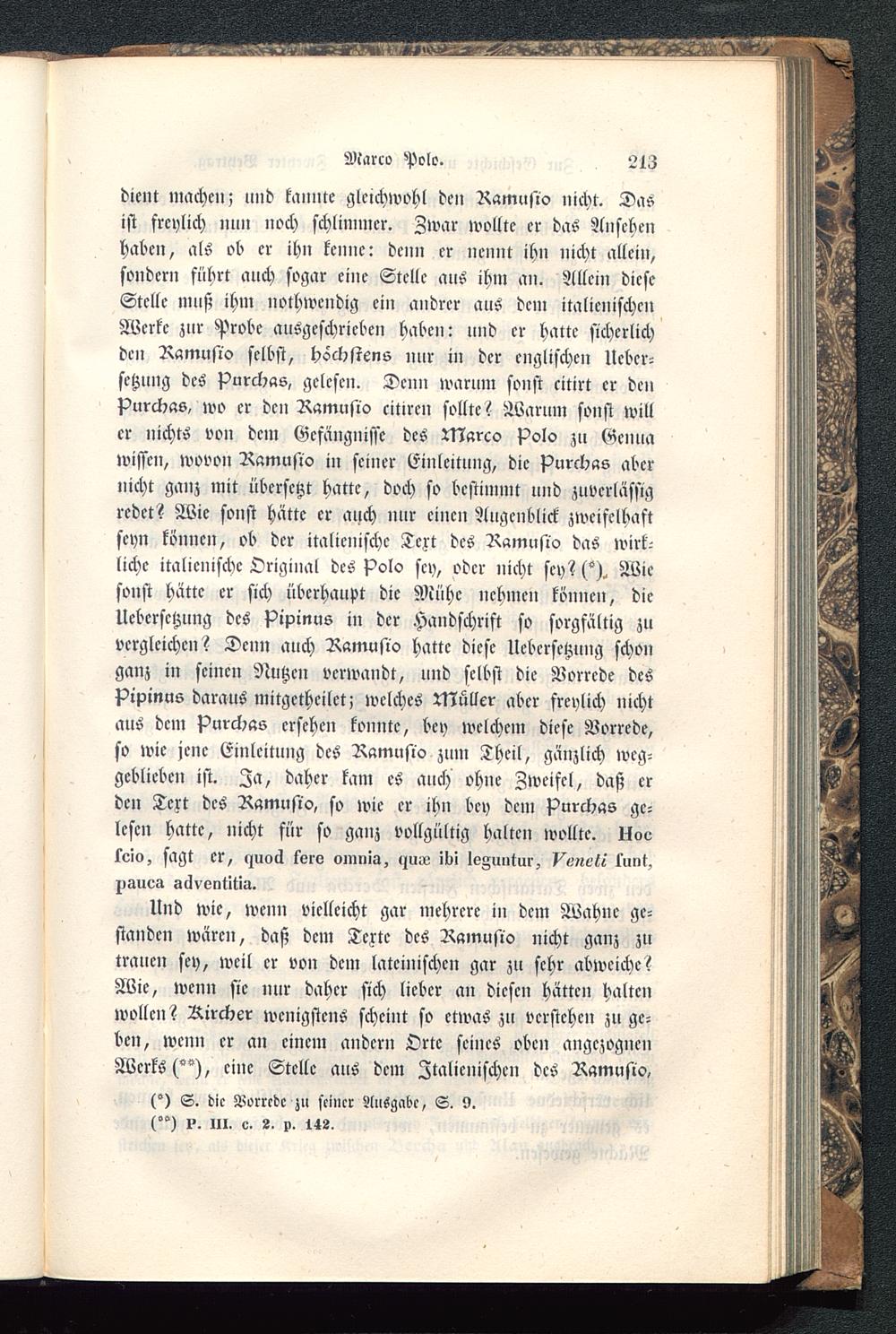 dient machen; und kannte gleichwohl den Ramusio nicht. Dasist freylich mm noch schlimmer. Zwar wollte er das Ansehenhaben, als ob er ihn kenne: denn er nennt ihn nicht allein,sondern führt auch sogar eine Stelle aus ihm an. Allein dieseStelle muß ihm nothwendig ein andrer aus dem italienischenWerke zur Probe ausgeschrieben haben: und er hatte sicherlichden Ramusio selbst, höchstens nur in der englischen Ucbcr-sctzung des Purchas, gelesen. Denn warum sonst citirt er denPurchas, wo er den Ramusio citiren sollte? Warum sonst willer nichts von dem Gefängnisse des Marco Polo zu Genua wissen, wovon Ramusio in seiner Einleitung, die Purchas abernicht ganz mit übersetzt hatte, doch so bestimmt und zuverlässigredet? Wie sonst hätte er auch nur einen Augenblick zweifelhaftseyn können, ob der italienische Text des Ramusio das wirk-liche italienische Original des Polo sey, oder nicht sey? (")^ Wiesonst hätte er sich überhaupt die Mühe nehmen können, dieUcbcrsctzung des Pipinus in der Handschrift so sorgfältig zuvergleichen? Denn auch Ramusio hatte diese Uebcrsctzung schonganz in seinen Nutzen verwandt, und selbst die Vorrede desPipinus daraus mitgetheilet; welches Mullcr aber freylich nichtaus dem Purchas ersehen konnte, bey welchem diese Vorrede,so wie jene Einleitung des Ramusio zum Theil, gänzlich weg-geblieben ist. Za, daher kam es auch ohne Zweifel, daß erden Text des Ramusio, so wie er ihn bey dem Purchas ge-lesen hatte, nicht für so ganz vollgültig halten wollte. Uo<-teio, sagt er, kjuoä terv omma, WM ibi leZuiitur, ^««c^t 1'unt,pimca sclvont'itia.