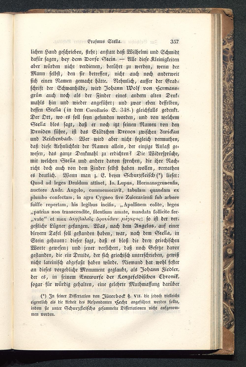 lichen Hand geschrieben, steht; anstatt daß Wilhelmi und Schmidtdafür sagen, bey Vem Dorfe Stein. — Alle diese Kleinigkeitenaber würden nicht verdienen, berührt zu werden, wenn derMann selbst, den sie betreffen, nicht auch noch anderweitsich einen Namen gemacht hätte. Nehmlich, ausser der Grab-schrift der Schwanhilde, wird Johann Wolf von Hcrmane-grün auch noch als der Finder eines andern alten Denk-mahls hin und wieder angeführt; und zwar eben desselben,dessen Stella (in dem eorollsrlo S. 348.) gleichfalls gedenkt.Der Ort, wo es soll seyn gefunden worden, und von welchemStell« blos sagt, daß er noch itzt seinen Namen von denDrniSen führe, ist das Städtchen Dreuen zwischen Arvickauund Reichenbach. Wer wird aber nicht sogleich vermuthen,daß diese Achnlichkeit der Namen allein, der einzige Anlaß ge-wesen, das ganze Denkmahl zu erdichten? Die Widersprüche,mit welchen Stella und andere davon sprechen, die ihre Nach-richt doch auch von dem Finder selbst haben wollen, verrathenes deutlich. Wenn man z. E. beym Schurzfleisch s") liefet:Huoä lezos Oruiäuiri attlaot, lo. I^upus, HermansFruAeriüs,Quetore ^liclr. ^ngolo, comm<Zi»oravit, tabulsm «zuanclsm expluinbo conteetsm, m gFro L;Aneo live Aniee-tvivnli lud srborekuiUo roportmn, k'is IvAibus inoilis, „^pollinem eolito, tegos„pstrins oon transcenclite, Llentimn amitte, manäata ^ollieito ter„vnte" et mox ^?^Z«^k7^ ^po^ickuiv ^e^^o^: so ist der ver^geßliche Lügner gefangen. Was, nach dem Zlngelus, auf einerblcyern Tafel soll gestanden haben, war, nach dem Stella, inStein gehauen: dieser sagt, daß es bloß die drey griechischenWorte gewesen; und jener versichert, daß noch Gesetze davorgestanden, die ein Druide, der sich griechisch unterschrieben, gewißnicht lateinisch abgefaßt haben würde. Niemand hat wohl festeran dieses vorgebliche Monument geglaubt, als Johann Ziedler,der es, in seinem Entwürfe der Kengefeldischcn Chronik,sogar für würdig gehalten, eine gelehrte Muthmassung darüber