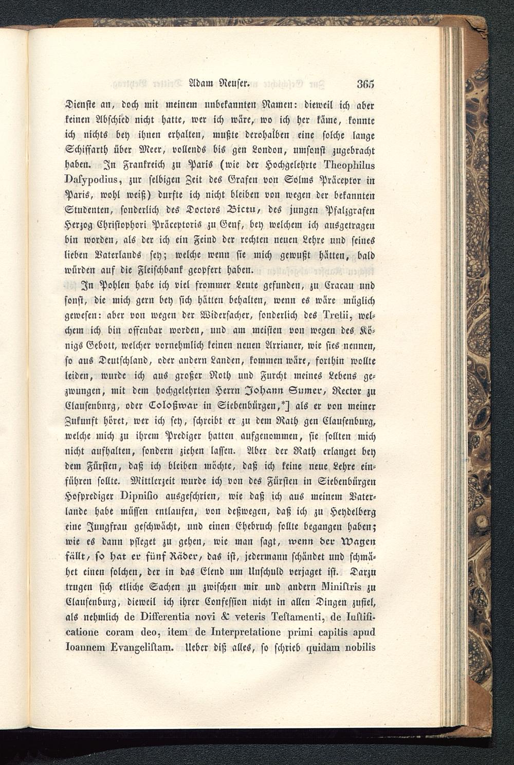 In Pohlen habe ich viel frommer Leute gefunden, zu Cracau undsonst, die mich gern bey sich hätten behalten, wenn es wäre müglichgewesen: aber von wegen der Widersacher, sonderlich des li-olii, wel-chem ich bin offenbar worden, und am meisten von wegen des Kö-nigs Gebolt, welcher vornehmlich keinen neuen Arriancr, wie sies nennen,so aus Deutschland , oder andern Landen, kommen wäre, forthin wollteleiden, wurde ich aus großer Noth und Furcht meines Lebens ge-zwungen, mit dem hochgelehrten Herrn Johann Stiiner, Rector zuClausenburg, oder Coloßwar in Siebenbürgen, ^ als er von meinerZukunft höret, wer ich sey, schreibt er zu dem Rath gen Clausenburg ,welche mich zu ihrem Prediger hatten aufgenommen, sie sollten michnicht aufhalten, sondern ziehen lassen. Aber der Rath erlanget beydem Fürsten , daß ich bleiben möchte, daß ich keine neue Lehre ein-führen sollte. Mittlcrzeit wurde ich von des Fürsten in Siebenbürgen Hofprcdiger vivnilto auSgeschrien, wie daß ich aus meinem Vater-landc habe müssen entlaufen, von deßwegen, daß ich zu Heydelbergeine Jungfrau geschwächt, und einen Ehebruch sollte begangen haben;wie es dann pfleget zu gehen, wie man sagt, wenn der Wagenfällt, so hat er fünf Räder, das ist, jedermann schändet und schmä-het einen solchen, der in das Elend um Unschuld verjaget ist. Darzutrugen sich etliche Sachen zu zwischen mir und andern MmKris zuClausenburg , dieweil ich ihrer Confession nicht in allen Dingen zufiel,als nehmlich äe Oitkerentia vovi A veteris leltarnenti, ilv lultiü-estione eorarn 6eo, item äo Interpretation» prirni espitis snucklosimein LvangoliKam. Ueber diß alles, so schrieb rluicliim notiilis