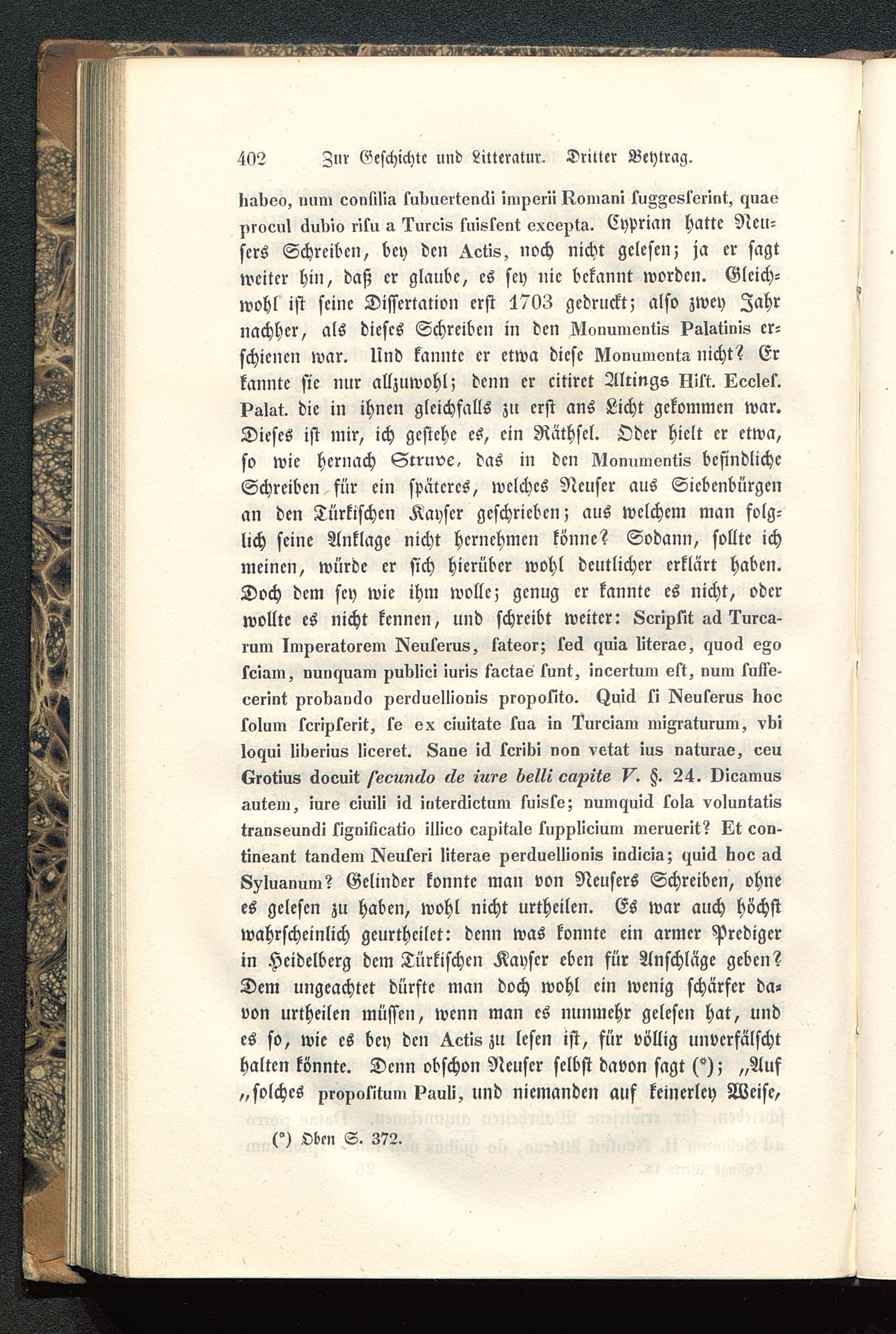Iialivo, imm conlilii» fuliueitencki iniporü üonmni tuAAosl'orint, «zsuac;s,rocu! Zudio ritu a?urcis luislont vxoepts. Cyprian hatte Ncu-scrs Schreiben, bey den ^otis, noch nicht gelesen; ja er sagtweiter hin, daß er glaube, es sey nie bekannt worden. Gleich-wohl ist seine Dissertation erst 1703 gedruckt; also zwey Zahrnachher, als dieses Schreiben in den Nonumontis palstinis er-schienen war. Und kannte er etwa diese Nonumvnts nicht? Erkannte sie mir allzuwohl; denn er citiret Allings HIN. Leelef.pslat. die in ihnen gleichfalls zu erst ans Licht gekommen war.Dieses ist mir, ich gestehe es, ein Räthsel. Oder hielt er etwa,so wie hernach Struve, das in den Nonnmentis befindlicheSchreiben für ein späteres, welches Neuser aus Siebenbürgen an den Türkischen Kayscr geschrieben; aus welchem man folg-lich seine Anklage nicht hernehmen könne? Sodann, sollte ichmeinen, würde er sich hierüber wohl deutlicher erklärt haben.Doch dem sey wie ihm wolle; genug er kannte es nicht, oderwollte es nicht kennen, und schreibt weiter: 8crip5it aä lures-ium Imperstorem Neuterus, tsteor; teä yuia literao, yuoä egosc'iam, vunlm»m pudliei luris taetse lunt, ineertum e5t, num lulle-eerint probitnllci perckuvlliouis propollto. tjuiä ti ^euserus koetnlum seripserlt, ke vx cluit-itv l°ua in ?urc!am migriiturum, vbiloyui litierius liceiot. 8aue i<I Icrioi von vetat !us naturae, oeuKrotius äoeuit /e<?»??^o öeM ea/?i'te §. 24. Oioamus
