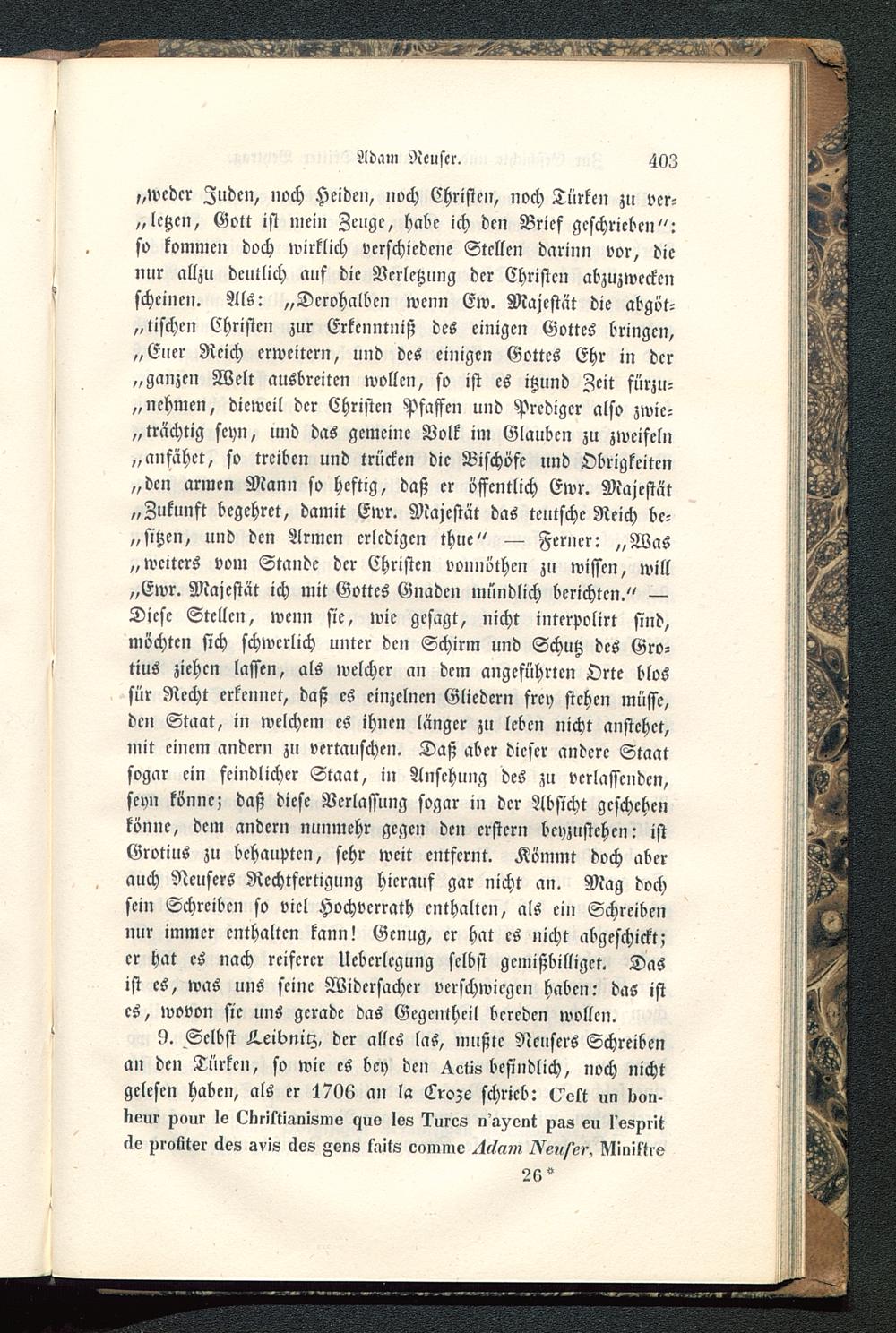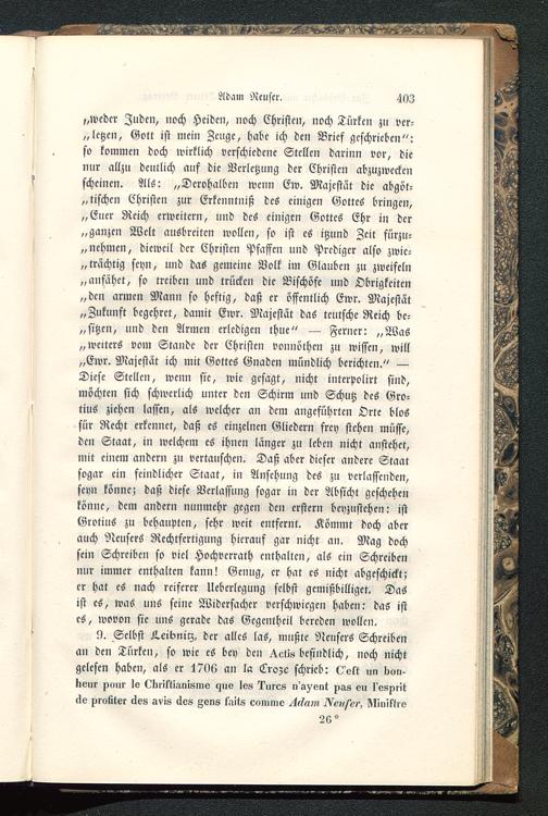 9. Selbst L.eibnilz, der alles las, mußte Neusers Schreibenan den Türken, so wie es bey den ^ctis befindlich, noch nichtgelesen haben, als er 1706 an la Crozc schrieb: Oett im Kon-Nvur pour lo Lkliktianisme lzuo Ivs lurcs n's^ent pas eu l'espritclo profiter cles svis äos Zens fnits cnmmo ^f/n?» ^Ve?/i/e,', lVIiiMrv
