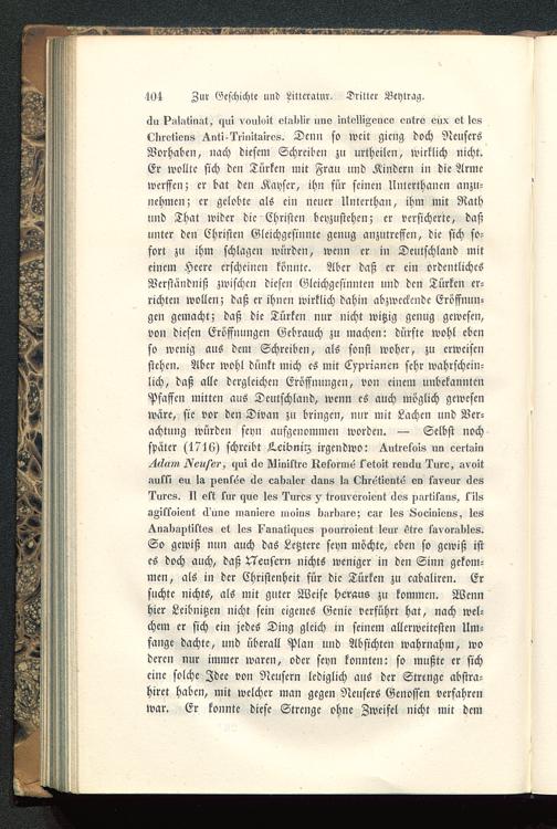6u p-llntin^t, hui vmiluit otalilir uns intvlligeneo entio vux et loseiirc-tlons ^nti-?i!»itÄirc!S. Denn so Weit gicng doch NcuscrsVorhaben, »ach diesem Schreiben zu urtheilen, wirklich nicht.Er wollte sich den Türken mit Frau und Kindern in die Armewerffcn; er bat den Kayscr, ihn für seinen Unterthanen anzu-nehmen; cr gelobte als ein neuer Unterthan, ihm mit Rathund That wider die Christen bcyzustchcn; cr versicherte, daßunter den Christen Gleichgesinnte genug anzutreffen, die sich so-fort zu ihm schlagen würden, wenn er in Deutschland miteinem Heere erscheinen konnte. Aber daß er ein ordentlichesVerständniß zwischen diesen Gleichgesinnten und den Türken er-richten wollen; daß cr ihnen wirklich dahin abzwcckcndc Eröffnun-gen gemacht; daß die Türken nur nicht witzig genug gewesen,von diesen Eröffnungen Gebrauch zu machen: dürfte wohl ebenso wenig aus dem Schreiben, als sonst woher, zu erweisenstehen. Aber wohl dünkt mich es mit Lypriancn sehr wahrschein-lich, daß alle dergleichen Eröffnungen, von einem unbekanntenPfaffen mitten aus Deutschland , wenn es auch möglich gewesenwäre, sie vor den Divan zu bringen, nur mit Lachen und Ver-achtung würden seyn aufgenommen worden. — Selbst nochspäter (1716) schreibt Aeibnirz irgendwo: Entresols ur> eertsin^c?«M ^Ve?«/«??', lM äo IVIirMro ketormv tvtoit rencku lure, avoitnutli eu la ponlvs ä«z csdalor clans la LIir6tiont<Z so tsveur <1es"lures. II ett tur yuv les lurcs trouveroiont äes Partisans, t"ilssgittolont cl'uniz manloio inoins burdarv; ear los 8ocinic!lis, les^Viiabaptittos et los I?snÄti«nio8 pmirrolont lenr vtro ssvoradles.So gewiß nun auch das Letztere seyn möchte, eben so gewiß istes doch auch, daß Neusern nichts weniger in den Sinn gekom-men, als in der Christenheit für die Türken zu cabaliren. Ersuchte nichts, als mit guter Weise heraus zu kommen. Wennhier Leibnitzen nicht sein eigenes Genie verführt hat, nach wel-chem er sich ein jedes Ding gleich in seinem allcrwcitcsten Um-fangt dachte, und überall Plan und Absichten wahrnahm, woderen nur immer waren, oder seyn konnten: so mußte er sicheine solche Zdec von Neuscrn lediglich aus der Strenge abstra-hlet haben, mit welcher man gegen Neuscrs Genossen verfahrenwar. Er konnte diese Strenge ohne Zweifel nicht mit dem