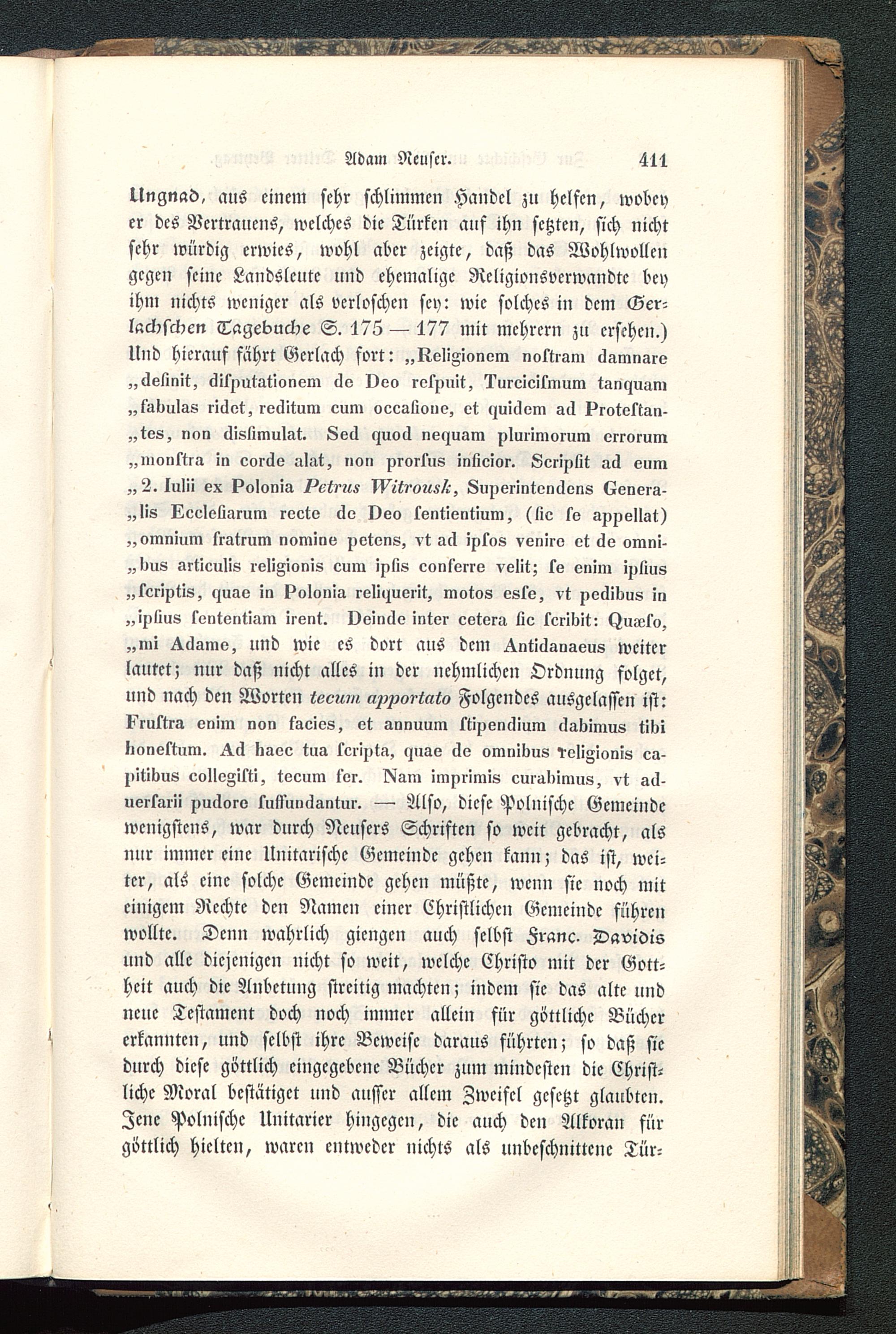 Ungnad, aus einem sehr schlimmen Handel zu helfen, wobeyer des Vertrauens, welches die Türken auf ihn setzten, sich nichtsehr würdig erwies, wohl aber zeigte, daß das Wohlwollengegen seine Landsleute und ehemalige Rcligionsvcrwandtc beyihm nichts weniger als verloschen sey: wie solches in dem Gcr-lachschcn Tagebuche S. 175 — 177 mit mchrcrn zu ersehen.)Und hierauf fährt Gerlach fort: „keliZionem nolriam clamnaro„äslinit, cli^intationvm 60 Oeo relpnit, 1'ureicilmum tan<zuam„l'almlas riäet, reclitum eum oeealioue, et «zuiclom ad protektan-„tes, nen llisiimulat. 8e«1 cjuocl nessuam pluiimorum errorum„nionttra in eoräe alat, »on prorsus intieior. Lcriplit ad eum„2. lulii ex polonia /^et, ?tL I^/tT'ott»/», Lu^erintonäens (Zenera-„lis Leeleliarum reetv cle Oeo t'entientium, (lie so appellat)„omnium fratrum nominv petens, vt all ipkns venirv et cle omni-z,l)us artieulis relizionis cum iplis eonferre velit; l^e enim ij>lius„tcriptis, r>uae in i?c»Ioiiia relttjuoiit, motos esse, vt ^edivus !n„iplius sentontiam irent. Oeincle inter cetera üe teribit: tjuseto,„nü ^clamv, und wie es dort aus dem ^nticlanaeus weiterlautet; nur daß nicht alles in der nehmlichen Ordnung folget,und nach den Worten a^o^ttto Folgendes ausgelassen ist:^ruktra enim non taeies, et annuum Kipenclium clabimus tibiIionektum. ^cl kaee tua teripta, «jnae cle omnibus ^eli^Ionis ca-^iltious eolleFikti, tecum for. IXam im^rimis cural»imus, vt ad-uerlarii puäoro tull'unilantur. — Also, diese Polnische Gemeindewenigstens, war durch Ncusers Schriften so weit gebracht, alsnur immereine Umtausche Gemeinde gehen kann; das ist, wei-ter, als eine solche Gemeinde gehen müßte, wenn sie noch miteinigem Rechte den Namen einer Christlichen Gemeinde führenwollte. Denn wahrlich giengcn auch selbst Zranc- Davidisund alle diejenigen nicht so weit, welche Christo mit der Gott-heit auch die Anbetung streitig machten; indem sie das alte undneue Testament doch noch immer allein für göttliche Büchererkannten, und selbst ihre Beweise daraus führten; so daß siedurch diese göttlich eingegebene Bücher zum mindesten die Christ-liche Moral bestätiget und ausser allem Zweifel gesetzt glaubten.Jene Polnische Unitarier hingegen, die auch den Alkoran fürgöttlich hielten, waren entweder nichts als unbeschnittcne Tür-