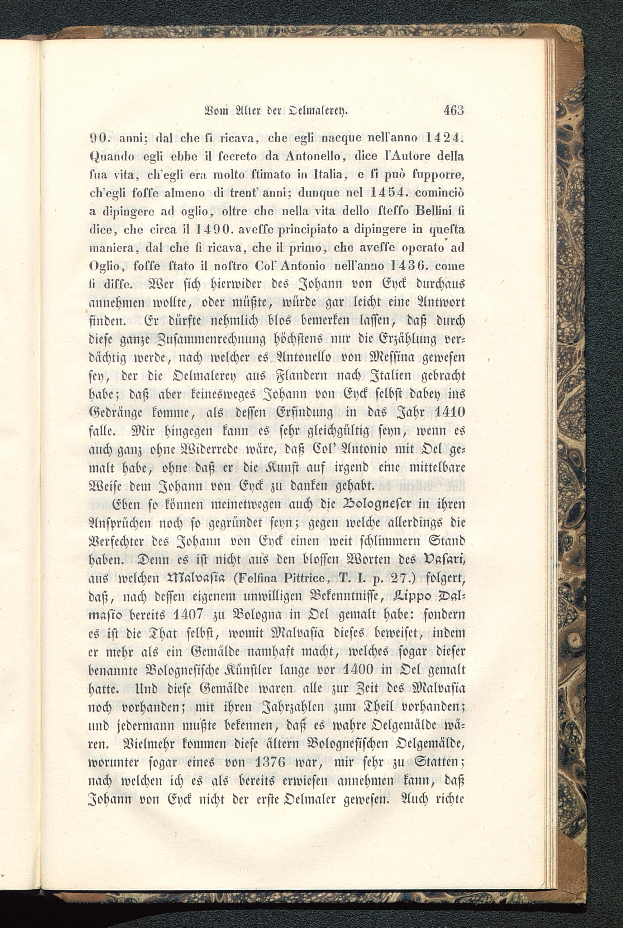 Eben so können meinetwegen auch die Bologneser in ihrenAnsprüchen noch so gegründet seyn; gegen welche allerdings dieVerfechter des Johann von Eyck einen weit schlimmern Standhaben. Denn es ist nicht aus den blossen Worten des vasari,aus welchen Malvasia (k^Ilina pittrieo, I. p. 27.) folgert,daß, nach dessen eigenem unwilligen Bekenntnisse, K-ippo Dal-masio bereits 4407 zu Bologna in Oel gemalt habe: sondernes ist die That selbst, womit Malvasia dieses beweiset, indemer mehr als ein Gemälde namhaft macht, welches sogar dieserbenannte Bologncsische Künstler lange vor 4400 in Oel gemalthatte. Und diese Gemälde waren alle zur Zeit des Malvasianoch vorhanden; mit ihren Zahrzahlcn zum Theil vorhanden;und jedermann mußte bekennen, daß es wahre Oelgcmäldc wä-ren. Vielmehr kommen diese ältern Bologncsischen Oclgcmälde,worunter sogar eines von 4376 war, mir sehr zu Statten?nach welchen ich es als bereits erwiesen annehmen kann, daßZobann von Eyck nicht der erste Oclmalcr gewesen. Auch richte