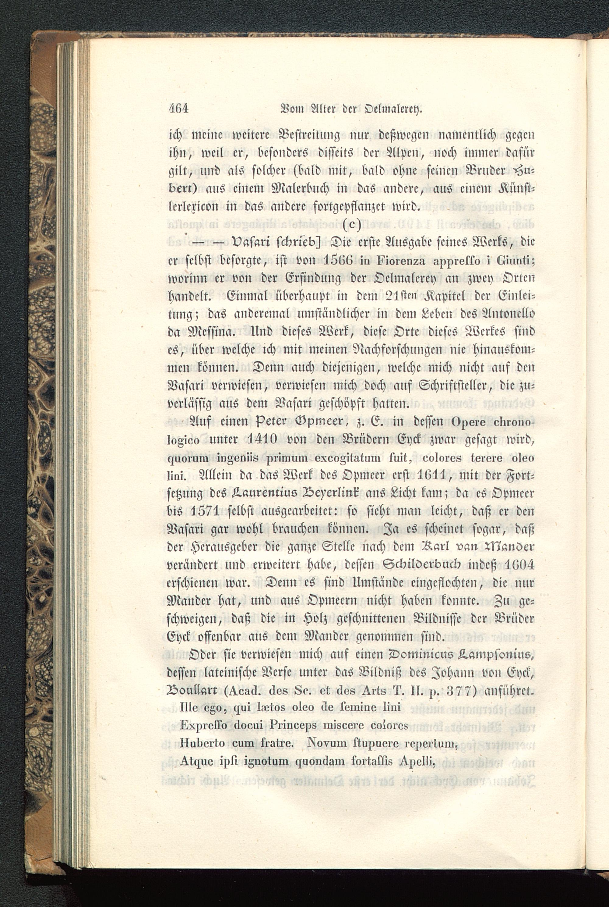 Auf einen Peter Gpmcer, z. E. in dessen Operv clnoim-InAieo unter 141l) von den Brüdern Eyck zwar gesagt wird,ljuoiiim inFoniis piimmn vxeoAitattim luit, evlares lerere olenIlni. Allein da das Werk des Opmecr erst 4611, mit der Fort-setzung des Z.aurcntius Zbeyerlink ans Licht kam; da es Opmecrbis 1671 selbst ausgearbeitet: so sieht man leicht, daß er denVasari gar wohl brauchen können. Za es scheinet sogar, daßder Herausgeber die ganze Stelle nach dem Rar! van ManServerändert und erweitert habe, dessen Sckilderbncb indeß 1K04erschienen war. Denn es sind Umstände cingcflochtcn, die nurMandcr hat, und aus Opmecrn nicht haben konnte. Zu ge-schweige», daß die in Holz geschnittenen Bildnisse der BrüderEyck offenbar aus dem Mandcr genommen sind.