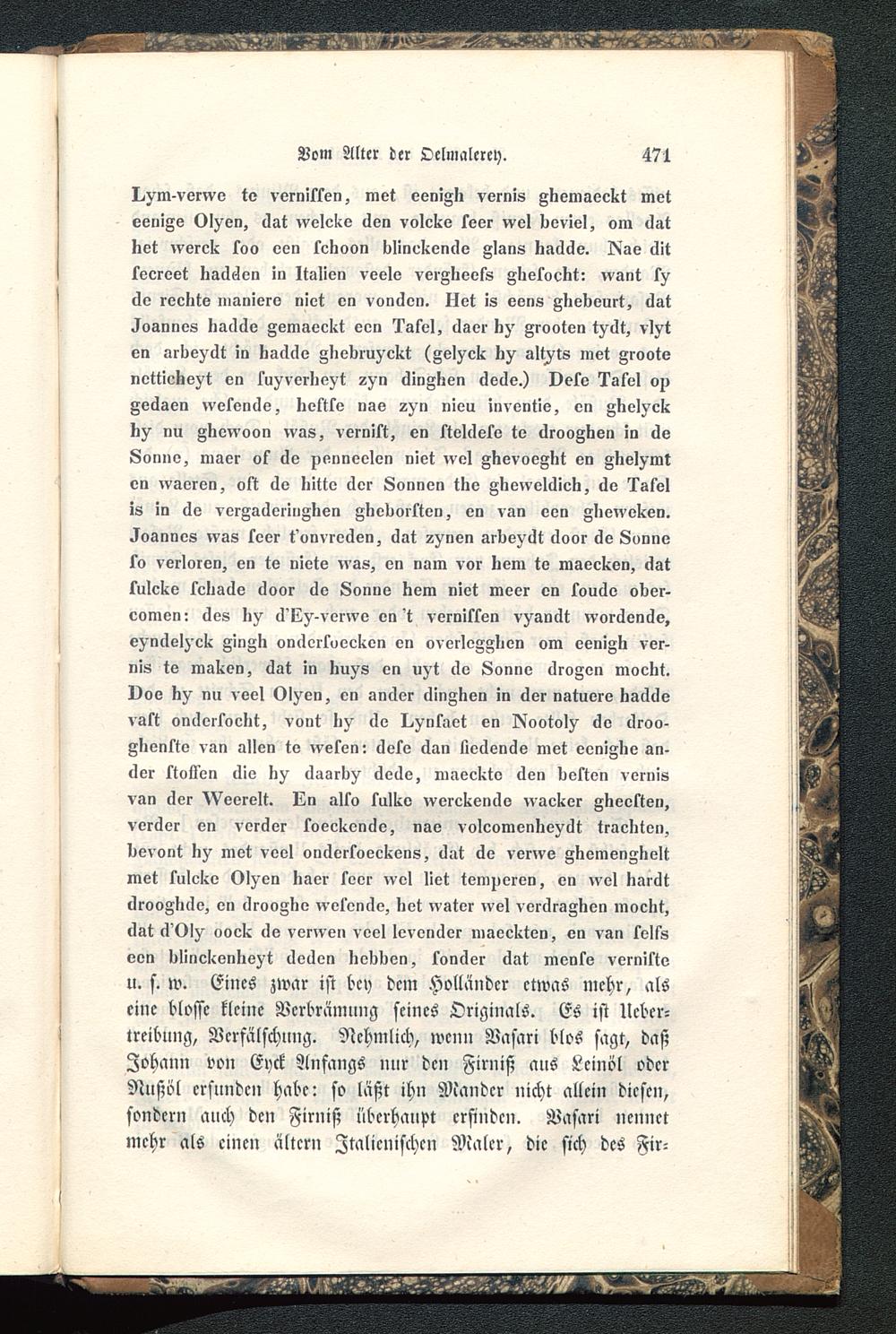 I^vm-vervvo to vormkten, met eonigli vernis gnemaeelit metvenigo Ol^en, dar >velol<e den volelco teer wol Iioviel, om clatliet >vereli too von tcnoon blinelionde Alans kaddo. I^ae cl!ttecreet kaädon in Italien veelo veiAlivvfs Aliotocnt: vvant 5/cle reelrtv nianierv niet vn vondon. liet is vens gnebenrt, dat^oannes nadde Femaeelit eeo I'asel, daer Frooten tvdt, vi^ten arvovdt in nadde Fliedruvvlit (Felveli kv altvts met Aiootenettiekevt en tuvveriievt ?vn dinAnen dede.) Oelv ?sfvl ongodaen betende, Iiektto nae 2vn nieu inventio, vn Anolveknv nu gnvvvoon was, vernist, en ttoldeto to droognon in deKönne, maer vf 60 ponneelen nivt wol »kevoeAnt vo »nelvmlen wavren, oft 60 Iiitte der Kennen tlio gneweldien, cle ?aselis in 60 verAadoiiiiFiion Fnedorttvn, en van eon Fiiewvlien.^oannos was leer t'onvreden, dat ?vnen aruevdt door do Könneto verloren, en to niete was, en nam vor dem to maeclco», dattulcliv tcliadv door dv Könne Iiem niot meer en toudo ober-vomon: dos Iiz^ d'IZv-vonve vn t vernitten v^anckt mordende,evndelvcl! Zingli ondertoeckon en overloFAlion ein eenigli ver-nis te malcen, dat in lruvs en uz't do Könne drogon moent.I)oo n^ nu veel Ol^en, vn ancler dinAnen in 6er natuvro naddovatt ondoitoelit, vont li^ do I^^ntaot en ^Xootolv do droo-Fliontto van allen to >veten : deke dan siedende met eoniglio an-6er ttollon clie li^ claarliv dede, maeclito den netten vernisvan der ^Voorelt. I?n also tnlliv >voreliendo >vael»or Alrootten,verdor en vorder loeckendo, nao volcomonnevdt traeliton,Iievont n^ met vvol ondortooelcons, clat do vorwe gnomonglioltmet tuloliv Oh'en naer teer wol liet temneren, on >vel kaidtdrooglido, on drooFno wotonde, liet wator wel vvrdrgAnen moclit,dat dOI^ oooli clo venven veel levender maecliton, en van telssvon ldinckonliovt deden nokdon, toncler clat monto vernittou. s. w. Eines zwar ist bey dem Holländer etwas mehr, alseine blosse kleine Verbrämung seines Originals. Es ist Ueber-treibung, Verfälschung. Nehmlich, wenn Wasari blos sagt, daßJohann von Eyck Anfangs nur den Firniß aus Leinöl oderNußöl erfunden habe: so läßt ihn Mandcr nicht allein diesen,sondern auch den Firniß überhaupt erfinden. Vasari nennetmehr als einen ältern Italienischen Maler, die sich des Fir-