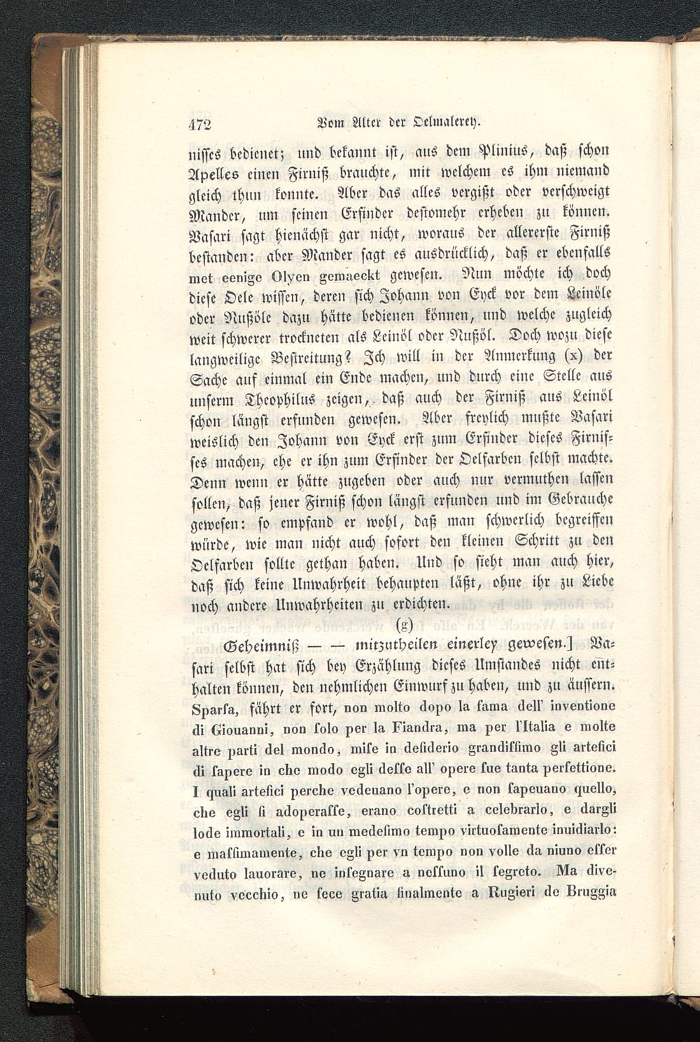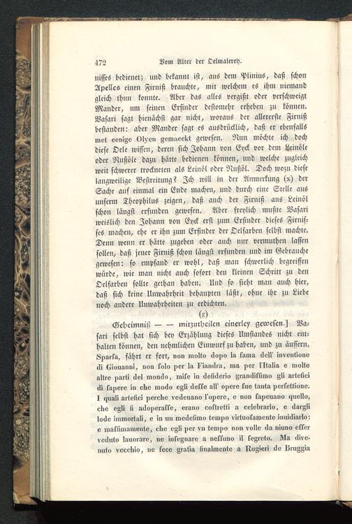 nisscs bedienet; lind bekannt ist, aus dem Plinius, daß schonApelles einen Firniß brauchte, mit welchem es ihm niemandgleich thun konnte. Aber das alles vergißt oder verschweigtMandcr, um seinen Erfinder dcstomchr erheben zu können.Nasari sagt hienächst gar nicht, woraus der allererste Firnißbestanden: aber Mandcr sagt es ausdrücklich, daß er ebenfallsmot vomAv VIvon Fem-leekt gewesen. Nun möchte ich dochdiese Ocle wissen, deren sich Johann von Eyck vor dem Leinöleoder Nußöle dazu hätte bedienen können, und welche zugleichweit schwerer trockneten als Leinöl oder Nnßöl. Doch wozu dieselangweilige Bestreitung? Zch will in der Anmerkung (x) derSache auf einmal ein Ende machen, und durch eine Stelle ausunserm Thcophilus zeigen, , daß auch der Firniß aus Leinölschon längst erfunden gewesen. Aber freylich mußte Nasariweislich den Johann von Eyck erst zum Erfinder dieses Firnis-ses machen, ehe er ihn zum Erfinder der Oelfarben selbst machte.Denn wenn er hätte zugeben oder auch nur vermuthen lassensollen, daß jener Firniß schon längst erfunden und im Gebrauchegewesen: so empfand er wohl, daß man schwerlich begreiffenwürde, wie man nicht auch sofort den kleinen Schritt zu denOelfarben sollte gethan haben. Und so sieht man auch hier,daß sich keine Unwahrheit behaupten läßt, ohne ihr zu Liebenoch andere Unwahrheiten zu erdichten.