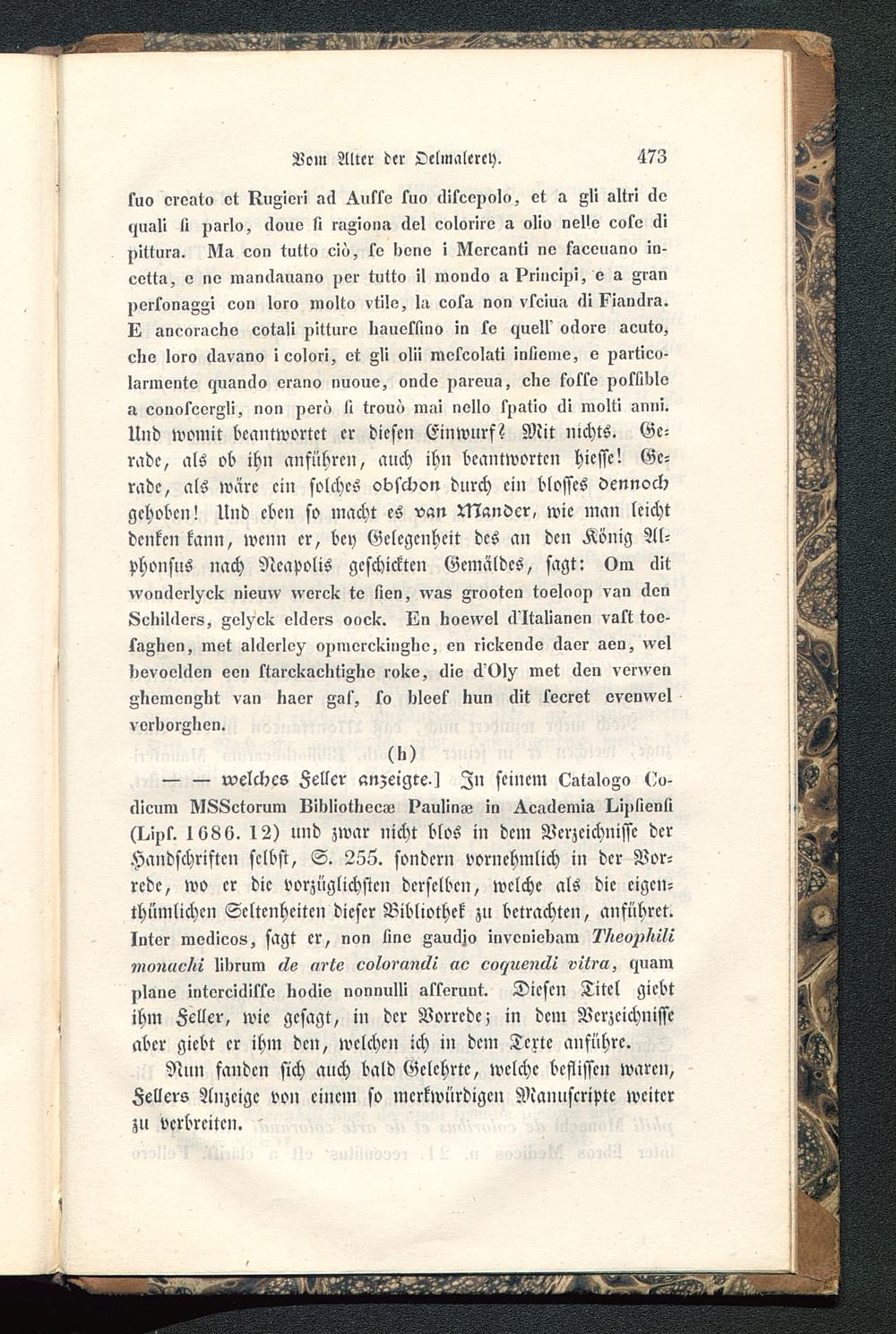 kuo ereato ot kuFiori ^utle tuo clifeepolo, et a F>i »Itri clelmali ll pari», <louo si raZinnit clel coloriro » olio nelle cot« <Zipitturs. KI» con tutto cm, tv liene i IVIercanti nv fscouano in-cetta, v ne manclausno per tutto il mon6o a Princip!, e a Franpertonagzi con loro molto vtilo, la cota non vseiua «1i k'ianclra.IZ ancoraeno cotali pitturo Iiauotlino in to i^uell' väors aeuto,cno loro clavano i colori, et Zli olii meteolati inlloine, e psrtico-larmento ljuanclo erano nuoue, onäe p-ireua, clie fotte polMIoa eoiinseorAli, non pero n trouö mm nello spatio cli molti mini.Und womit beantwortet er diesen Einwurf? Mit nichts. Ge-rade, als ob ihn anführen, auch ihn beantworten hiesse'. Ge-rade, als wäre ein solches obschon durch ein blosses dennochgehoben! Und eben so macht es van Mander, wie man leichtdenken kann, wenn er, bey Gelegenheit des an den König Al-phonsus nach Neapolis geschickten Gemäldes, sagt: 0m äit^vonclcrl^cli niernv ,verel< te lien, ,vag grooten tooloop vgn denKcliilclers, Aol^-cli olclers onclc. ün koewvl lVIWlianen vatt too-tarnen, mvt slclerlo^ opmorcl<i»Flie, en rielivn6o claor avn, >velkovoelclen een ttareliaclitiAne rolco, llio 6 01^ mot clen vertongnemenglit van tiaer gilt, to l^Ieek nun clit teeret ovenvvvlverdoiglien.