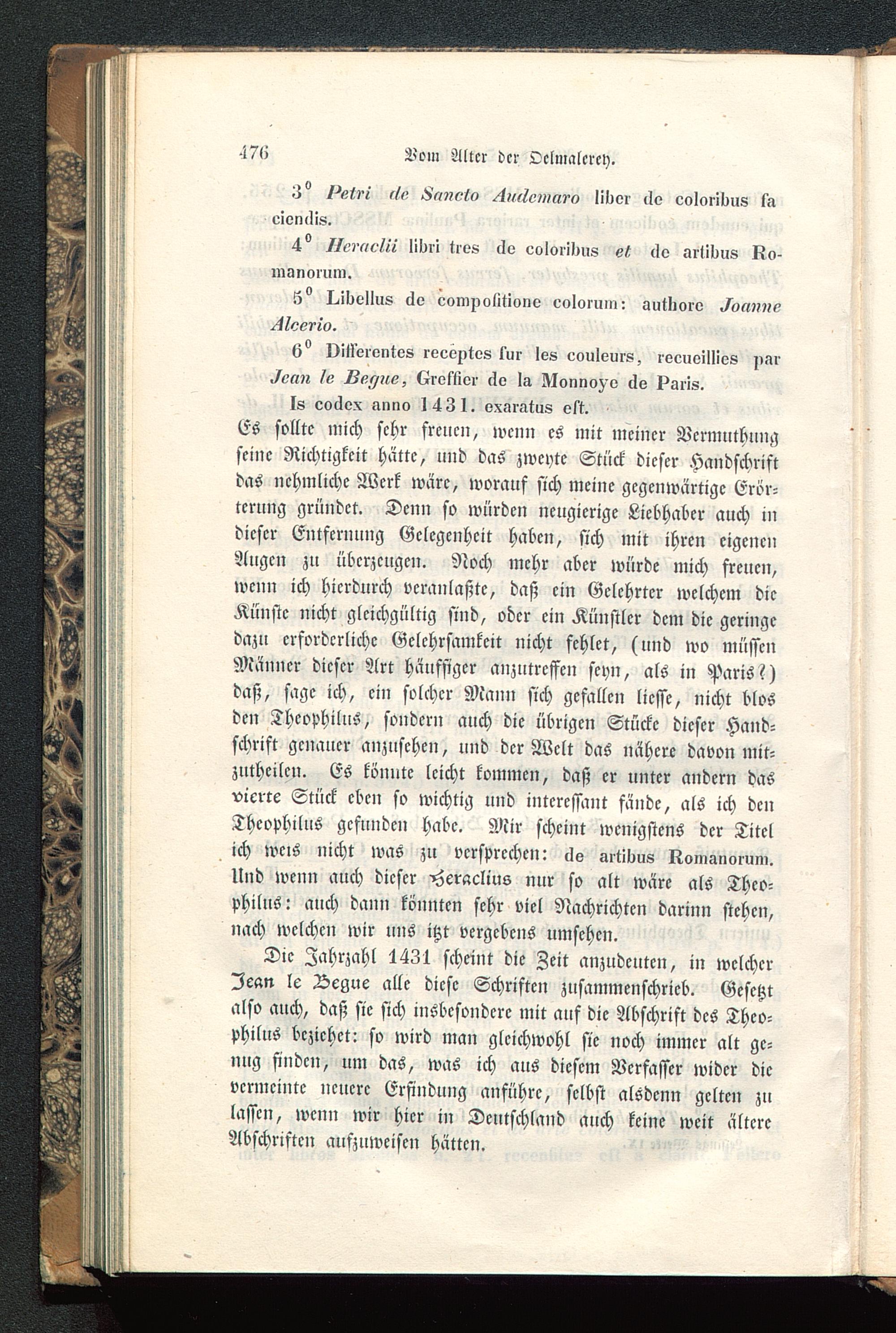 Is co6ox ktnno 1431. vx.iratus ost.Es sollte mich sehr freuen, wcnn es mit meiner Vermuthungseine Richtigkeit hätte, und das zweyte Stuck dieser Handschriftdas nehmliche Werk wäre, worauf sich meine gegenwärtige Erör-terung gründet. Denn so würden neugierige Liebhaber auch indieser Entfernung Gelegenheit haben, sich mit ihren eigenenAugen zu überzeugen. Noch mehr aber würde mich freuen,wcnn ich hierdurch veranlaßte, daß ein Gelehrter welchem dieKünste nicht gleichgültig sind, oder ein Künstler dem die geringedazu erforderliche Gelehrsamkeit nicht fehlet, (und wo müssenMänner dieser Art häufsigcr anzutreffen seyn, als in Paris ?)daß, sage ich, ein solcher Mann sich gefallen liesse, nicht blosden Theophilus, sondern auch die übrigen Stücke dieser Hand-schrift genauer anzusehen, und der Welt das nähere davon mit-zutheilen. Es könnte leicht kommen, daß er unter andern dasvierte Stück eben so wichtig und interessant fände, als ich denTheophilus gefunden habe. Mir scheint wenigstens der Titelich weis nicht was zu versprechen: cls artibus komanmum.Und wenn auch dieser ^Hcraclius nur so alt wäre als Theo-philus: auch dann könnten sehr viel Nachrichten darinn stehen,nach welchen wir uns itzt vergebens umsehen.