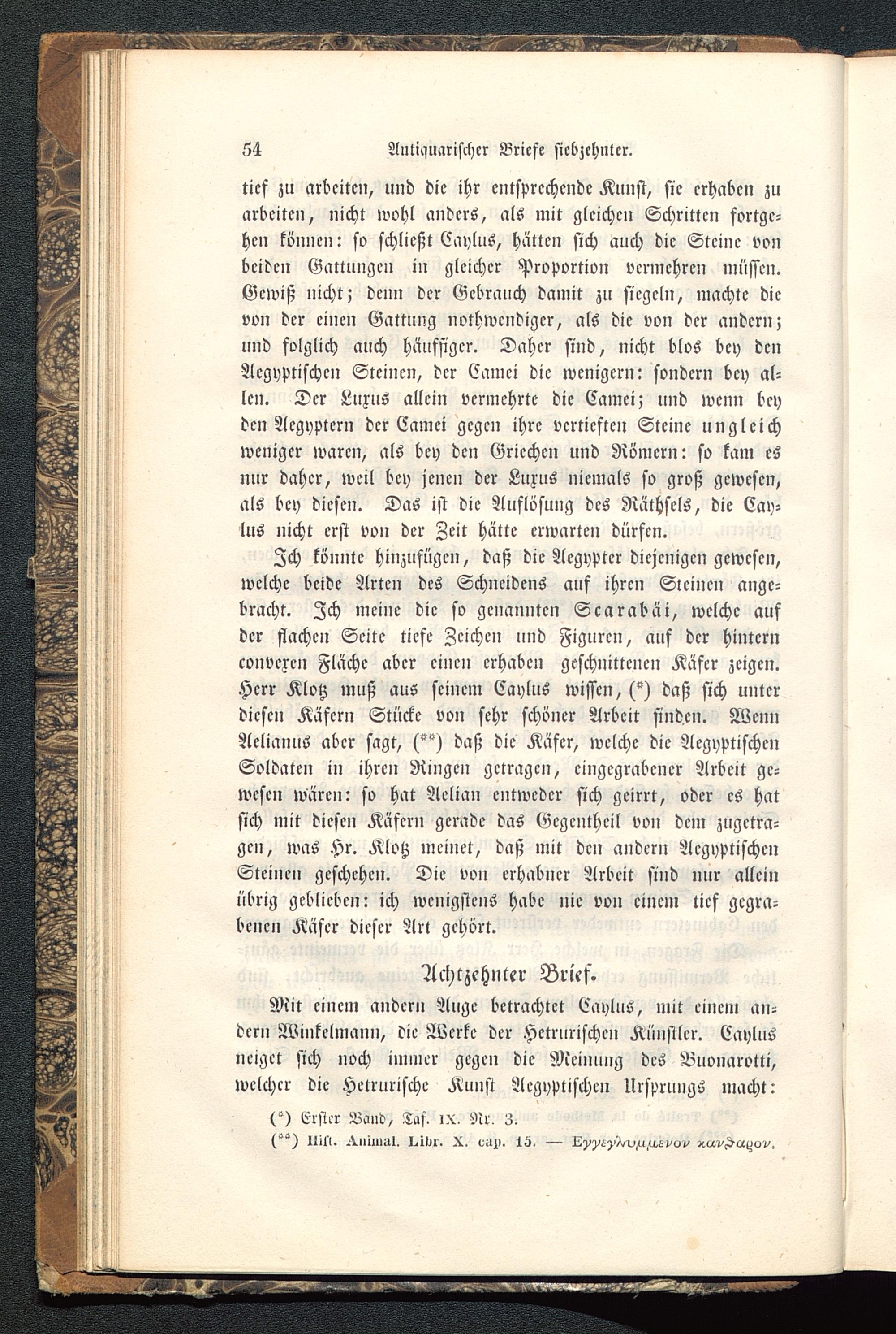Zch könnte hinzufügen, daß die Acgyptcr diejenigen gewesen,welche beide Arten des Schneidens auf ihren Steinen ange-bracht. Zch meine die so genannten Scarabäi, welche aufder flachen Seite tiefe Zeichen nnd Figuren, auf der hinterncoiivexc» Fläche aber einen erhaben geschnittenen Käfer zeigen.Herr Klotz muß aus seinem Caylus wissen, (°) daß sich unterdiesen Käfern Stücke von sehr schöner Arbeit finden. WennAelianuS aber sagt, ("") daß die Käfer, welche die AcgyptischcnSoldaten in ihren Ringen getragen, cingcgrabcncr Arbeit ge-wesen wären: so hat Aclian entweder sich geirrt, oder es hatsich mit diese» Käfern gerade das Gegentheil von dem zugetra-gen, was Hr. Klotz meinet, daß mit den andern AcgyptischcnStcinc» gcschchcn. Die von erhabner Arbeit sind nur alleinübrig geblieben: ich wenigstens habe nie von einem tief gegra-benen Käfer dicscr Art gchört.