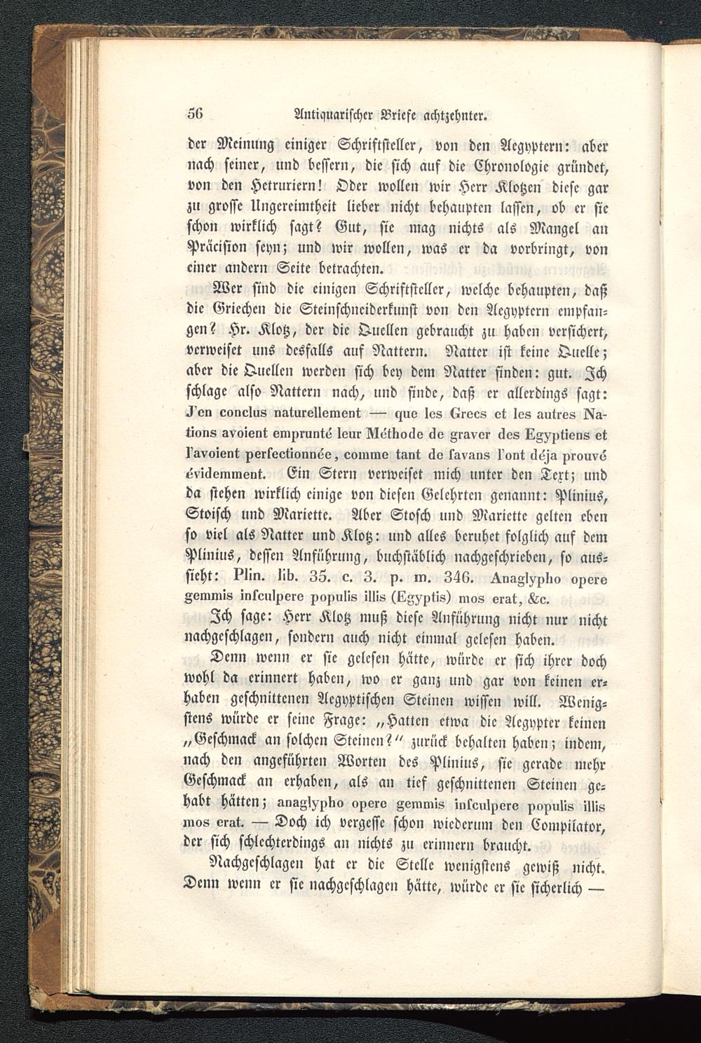 Wer sind die einigen Schriftsteller, welche behaupten, daßdie Griechen die Steinschnciderknnst von den Acgyptcrn empfan-gen? Hr. Klotz, der die Quellen gebraucht zu haben versichert,verweiset uns dcsfalls auf Nattern. Natter ist keine Quelle;aber die Quellen werden sich bey dem Natter finden: gut. Ichschlage also Nattern nach, und finde, daß er allerdings sagt:^ on eonelus naturelloment — yuo los Krocs et les autres Na-tion« svoient empruntv lour Nvtlioilo 6v gravoi- tlos LZ^itions etI'svoiont porlvetionnviz, commo tant ö'o lavans I'ont <I6ja prouv6vviclemmellt. Ein Stern verweiset mich unter den Text; undda stehen wirklich einige von diesen Gelehrten genannt: PliniuS ,Stoisch und Marictte. Aber Stosch und Marictte gelten ebenso viel als Nattcr und Klotz: und alles beruhet folglich auf demPlinius , dessen Anführung, buchstäblich nachgeschrieben, so aus-sieht: ?Iin. lib. 3Z. c. 3. si. m. 346. ^vagl^plio oporvAvmmis intculperv pa^iulis illis (IZMptis) mos orat, ^10.