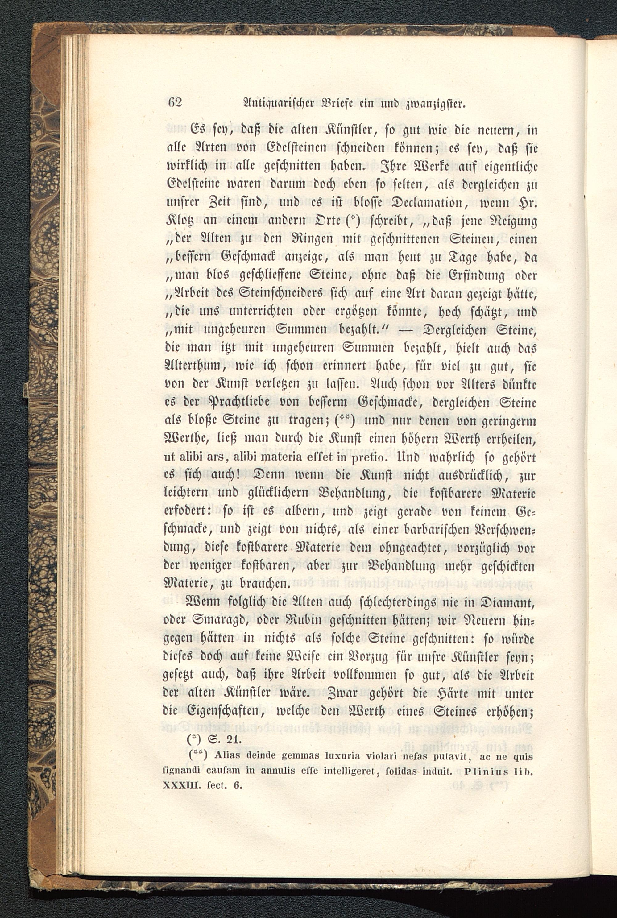 Es sey, daß die alten Künstler, so gut wie die neuern, inalle Arten von Edelsteinen schneiden können; es sc«, daß siewirklich in alle geschnitten haben. Zhrc Werke ans eigentlicheEdelsteine waren darum doch eben so selten, als dergleichen zuunsrer Zeit sind, und es ist blosse Dcclamation, wenn Hr.Klotz an einem andern Orte (°) schreibt, „daß jene Neigung„der Alten zu den Ringen mit geschnittenen Steinen, einen„bessern Geschmack anzeige, als man heut zu Tage habe, da„man blos geschlossene Steine, ohne daß die Erfindung oder„Arbeit des Steinschneiders sich aus eine Art daran gezeigt hatte,„die uns unterrichten oder ergötzen könnte, hoch schätzt, und„mit ungeheuren Summen bezahlt." — Dergleichen Steine,die man itzt mit ungeheuren Summen bezahlt, hielt auch dasAlterthum, wie ich schon erinnert habe, für viel zu gut, sievon der Kunst verletzen zu lassen. Auch schon vor Alters dünktees der Prachtlicbe von bessern? Geschmacke, dergleichen Steineals bloße Steine zu tragen; und nur denen von geringermWerthe, ließ man durch die Kunst einen höhcrn Werth ertheilen,ut aliki ars, alid! matoria ostl-t in Kretin. Und wahrlich so gehörtes sich auch! Denn wenn die Kunst nicht ausdrücklich, zurleichtern und glücklichern Behandlung, die kostbarere Materieerfodcrt: so ist es albern, und zeigt gerade von keinem Ge-schmacke, und zeigt von nichts, als einer barbarischen Verschwen-dung, diese kostbarere Materie dem ohngcachtct, vorzüglich vorder weniger kostbaren, aber zur Behandlung mehr geschicktenMaterie, zu brauchen.