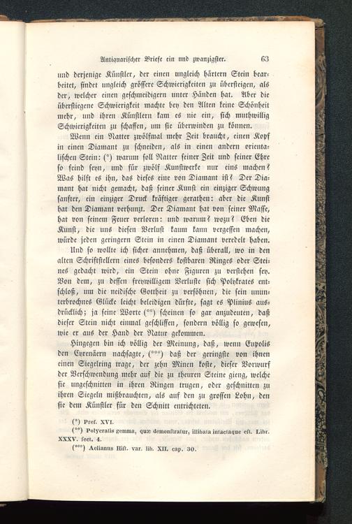 Hingegen bin ich völlig der Meinung, daß, wenn Eupolis den Cyrcnäern nachsagte, (^«) daß der geringste von ihneneinen Siegelring trage, der zehn Minen koste, dieser Vorwurfder Verschwendung mehr auf die zu theuren Steine gieng, welchesie ungcschnittcn in ihren Ringen trugen, oder geschnitten zuihren Siegeln mißbrauchten, als auf den zu grossen Lohn, densie dem Künstler für den Schnitt entrichteten.