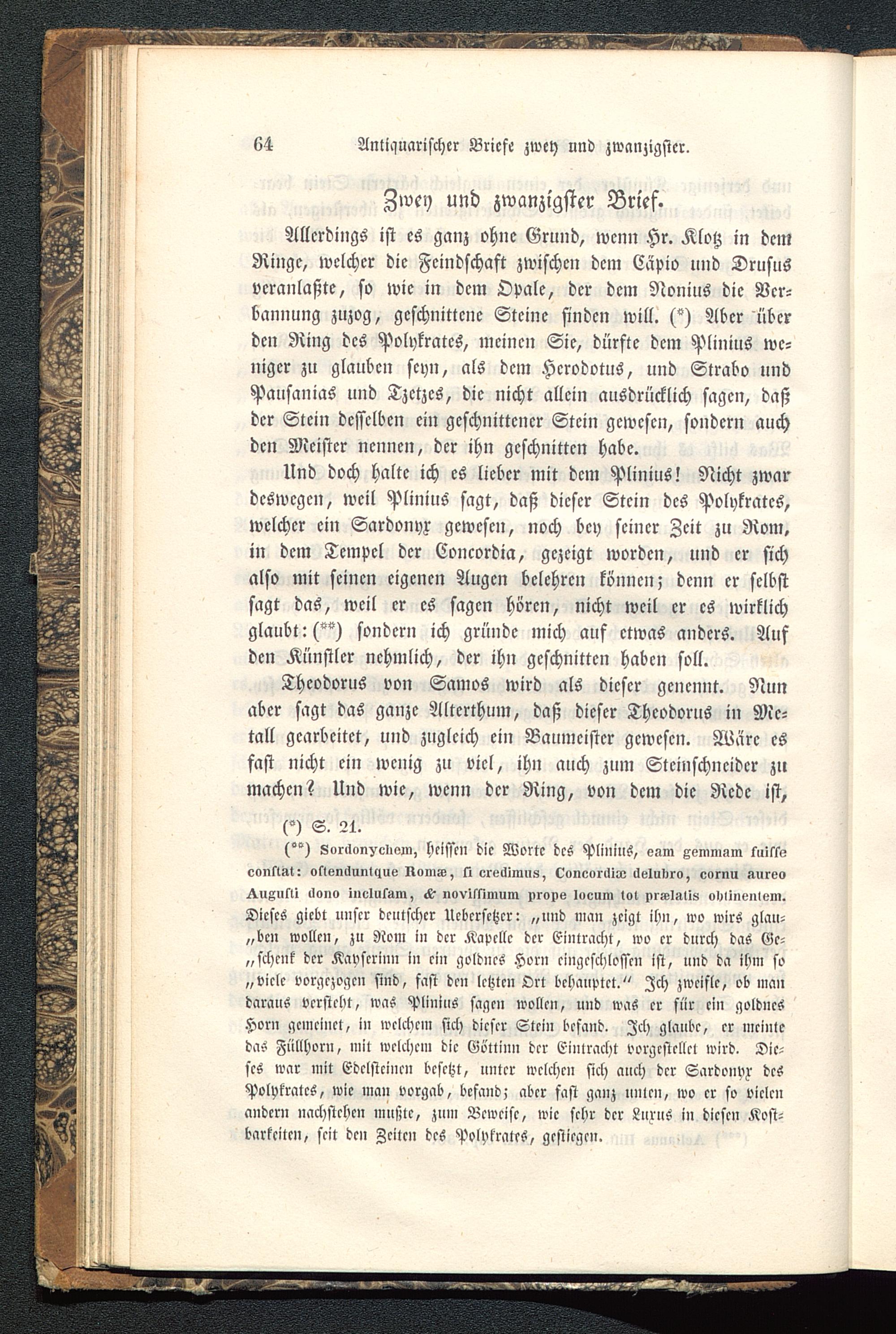 Allerdings ist cs ganz ohne Grund, wenn Hr. Klotz in demRinge, welcher die Feindschaft zwischen dem Capio und DrusuS veranlaßte, so wie in dem Opale, der dem Nonius die Ver-bannung zuzog, geschnittene Steine finden will. (°) Aber überden Ring des Polykrates, meinen Sie, dürste dem Plinius we-niger zu glauben seyn, als dem Hcrodotus, und Strabo undPansanias und Tzctzcs, die nicht allein ausdrücklich sagen, daßder Stein desselben ein geschnittener Stein gewesen, sondern auchden Meister nennen, der ihn geschnitten habe.