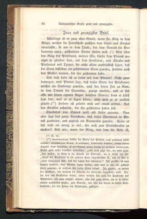 Und doch halte ich es lieber mit dem Plinius! Nicht zwardeswegen, weil Plinius sagt, daß dieser Stein des Polykrates,welcher ein Sardonyx gewesen, noch bey seiner Zeit zu Rom ,in dem Tempel der Concordia, gezeigt worden, und er sichalso mit seinen eigenen Augen belehren können; denn er selbstsagt das, weil er cs sagen hören, nicht weil er es wirklichglaubtsondern ich gründe mich auf etwas anders. Aufden Künstler nehmlich, der ihn geschnitten haben soll.
