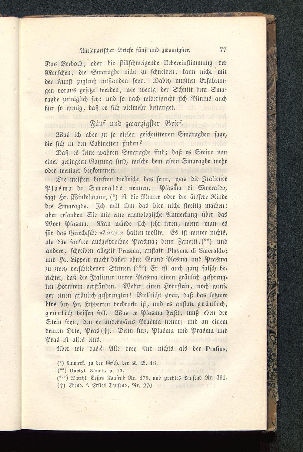 Die meisten dürsten vielleicht das seyn, was die ItalienerPlasma di Smeraldo nennen. PlaSma di Smeraldo,sagt Hr. Winkclmann, ist die Mutter oder die äussere Rindedes Smaragds . Ich will ihm das hier nicht streitig machen:aber erlauben Sie mir eine etymologische Anmerkung über dasWort Plasma. Man würde sich sehr irren, wenn man esfür das Griechische ^«c?^>.« halten wollte. Es ist weiter nichts,als das sanfter ausgcsprochnc Prasma; denn Zanetti,(^) undandere, schreiben allezeit prasma, anstatt Plasma, äi Smoralclo;und Hr. Lippert macht daher ohne Grund Plasma und Prasmazu zwey verschiedenen Steinen. Er ist auch ganz falsch be-richtet, daß die Italiener unter Plasma einen gräulich gespreng-ten Hornstcin verstünden. Weder einen Hornstein, noch weni-ger einen gräulich gesprengten! Vielleicht zwar, daß das letztereblos bey Hr. Lippcrtcn verdruckt ist, und es anstatt gräulich,grünlich hcissen soll. Was er Plasma heißt, muß eben derStein seyn, den er anderwärts Prasma nennt; und an einemdritten Orte, Pras (5). Denn kurz, Plasma und Prasma undPras ist alles eins.