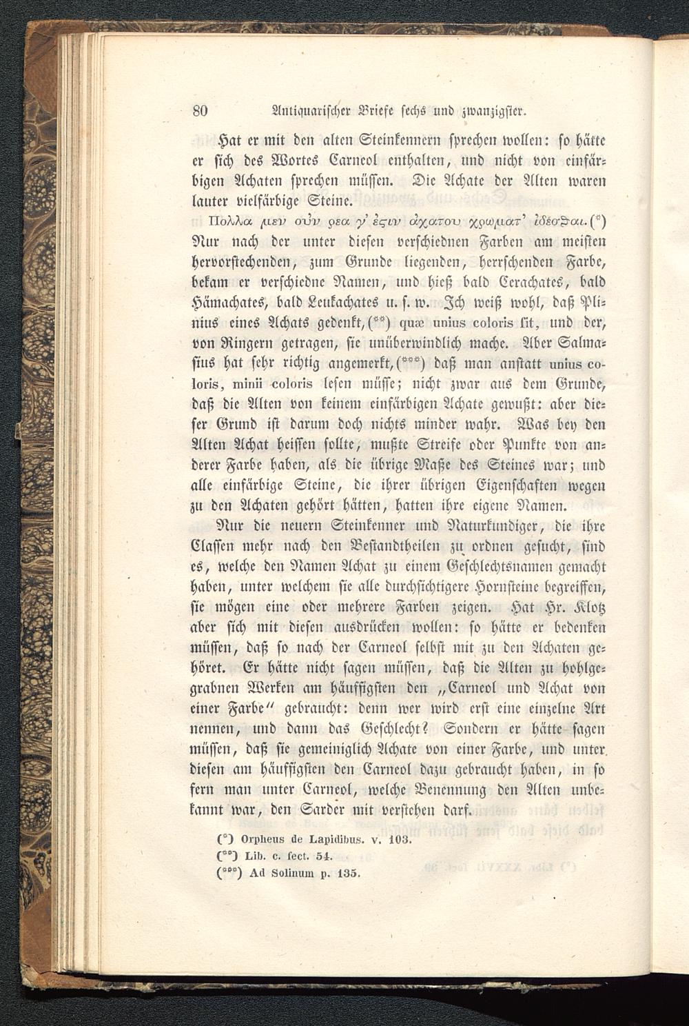 Nur nach der unter diesen vcrschiedncn Farben am meistenhervorstechende», zum Grunde liegenden, herrschenden Farbe,bekam er verschicdnc Name», und hieß bald Ccrachatcs, baldHämachates, bald Lcukachatcs u. s. w. Ich weiß wohl, daß Pli-nius eines Achats gedenkt, ^-v unius coloris lit, und der,von Ringern getragen, sie unüberwindlich mache. Aber Salma-sius hat sehr richtig angemerkt, ("°°) daß man anstatt unius eo-Ion's , mini! coloris lesen müsse; nicht zwar aus dem Grunde,daß die Alten von keinem einfarbigen Achate gewußt: aber die-ser Grund ist darum doch nichts minder wahr. Was bey denAlten Achat heisscn sollte, mußte Streife oder Punkte von an-derer Farbe haben, als die übrige Maße des Steines war; undalle einfarbige Steine, die ihrer übrigen Eigenschaften wegenzu den Achaten gehört hätten, hatten ihre eigene Namen.