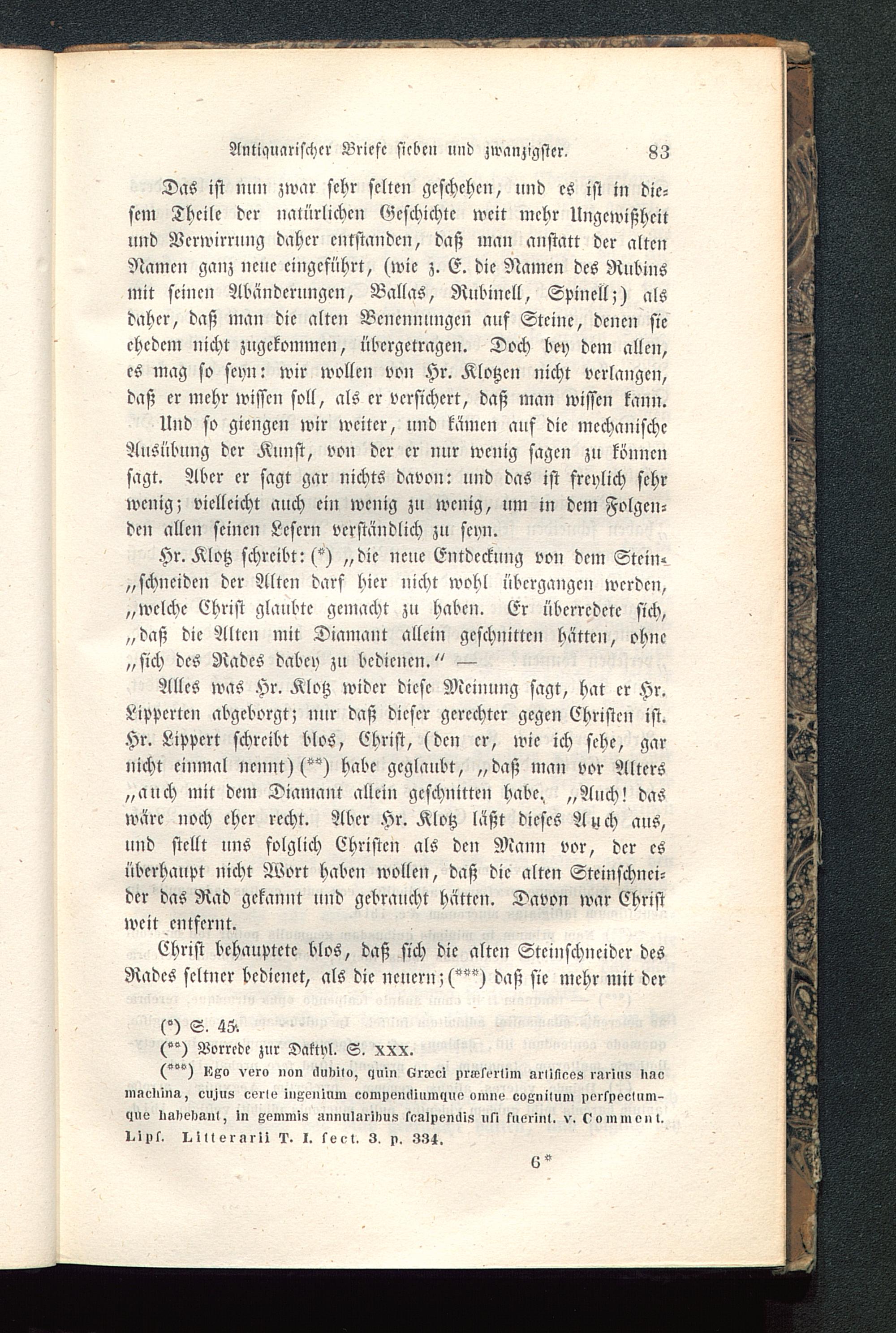 Alles was Hr. Klotz wider diese Meinung sagt, hat er Hr.Lippcrtcn abgcborgt; nur daß dieser gerechter gegen Christen ist.Hr. Lippcrt schreibt blos, Christ, (den er, wie ich sehe, garnicht einmal nennt) (") habe geglaubt, „daß man vor Alters„auch mit dem Diamant allein geschnitten habe. „Auch! daswäre noch eher recht. Aber Hr. Klotz läßt dieses Auch ans,nnd stellt uns folglich Christen als den Mann vor, der esüberhaupt nicht Wort haben wollen, daß die alten Steinschnei-der das Rad gekannt und gebraucht hätten. Davon war Christweit entfernt.
