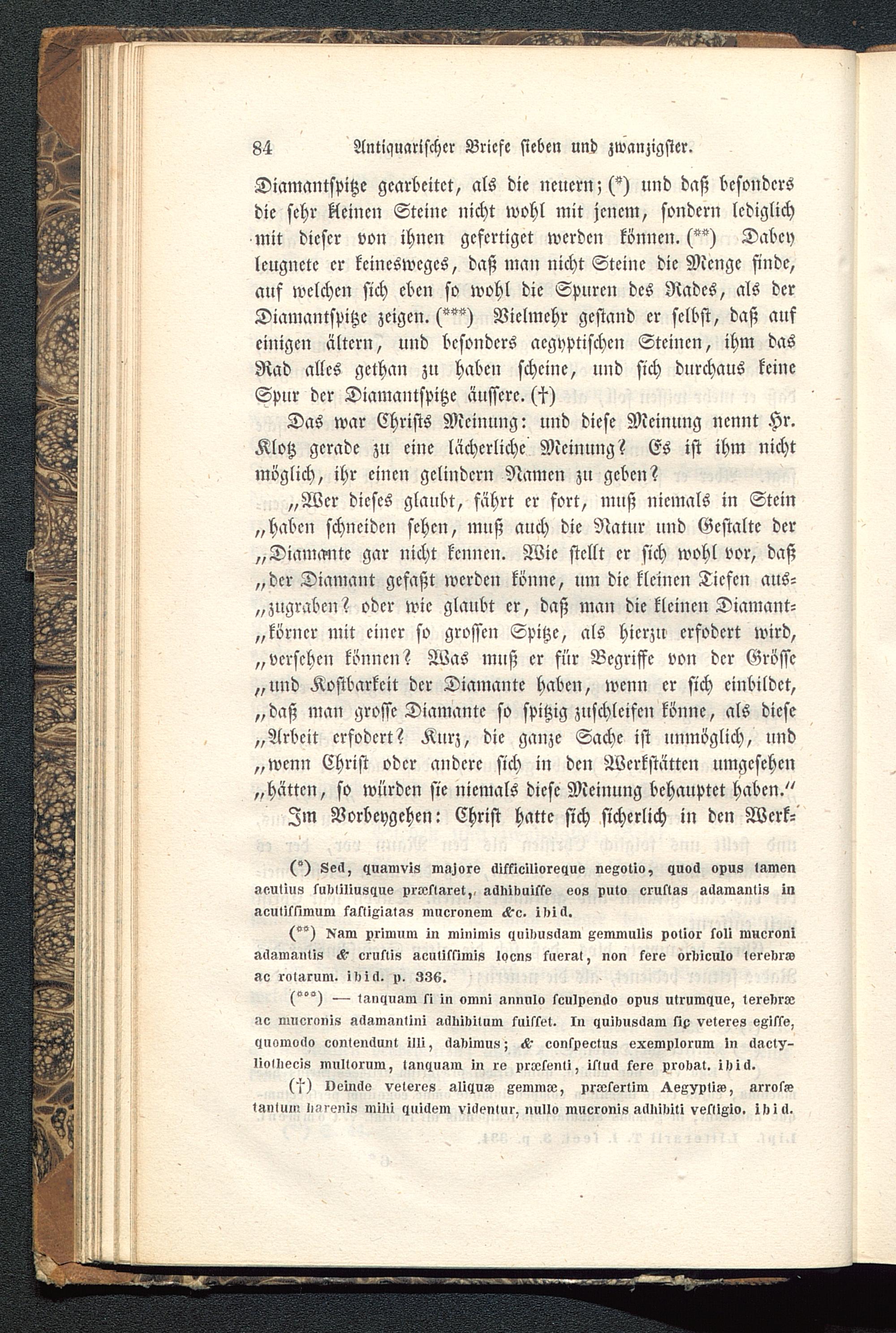 „Wer dieses glaubt, fährt er fort, muß niemals in Stein„haben schneiden sehen, muß auch die Natur und Gestalte der„Diamante gar nicht kennen. Wie stellt er sich wohl vor, daß„der Diamant gefaßt werden könne, um die kleinen Tiefen ans-„zugraben? oder wie glaubt er, daß man die kleinen Diamant-„körncr mit einer so grossen Spitze, als hierzu erfodert wird,„versehen können? Was muß er für Begriffe von der Grösse„und Kostbarkeit der Diamante haben, wenn er sich einbildet,„daß man grosse Diamante so spitzig zuscylcifen könne, als diese„Arbeit erfodert? Kurz, die ganze Sache ist unmöglich, und„wenn Christ oder andere sich in den Werkstätten umgesehen„hätten, so würden sie niemals diese Meinung behauptet haben."