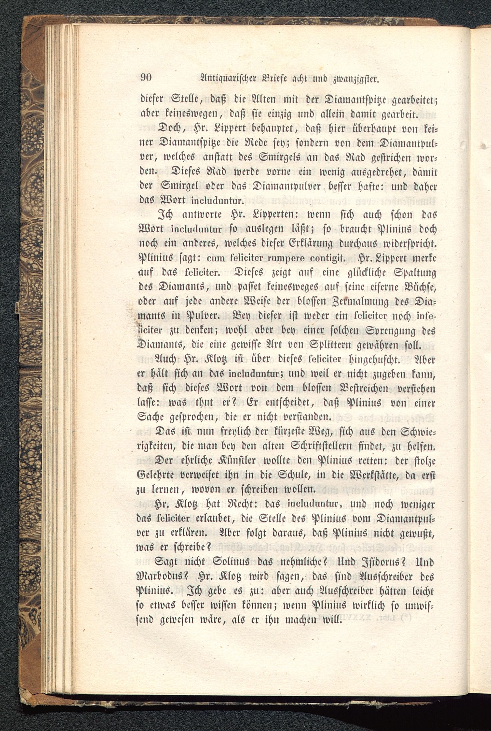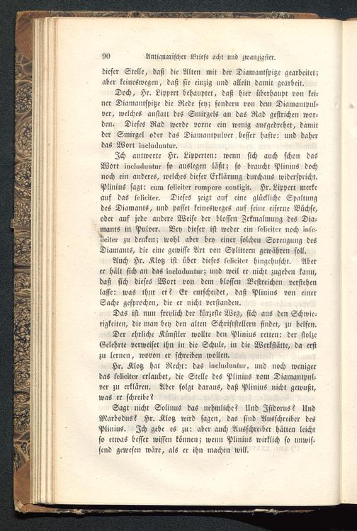 Ich antworte Hr. Lipperten: wenn sich auch schon dasWort inclulllintur so auslegen läßt; so braucht Plinius dochnoch ein anderes, welches dieser Erklärung durchaus widerspricht.Plinius sagt: cum klieiter rumpvrv eontiglt. Hr. Lippert merkeauf das felieiter. Dieses zeigt auf eine glückliche Spaltungdes Diamants, und passet kcincsweges auf seine eiserne Büchse,oder auf jede andere Weise der blossen Zckmalmung des Dia-mants in Pulver. Bey dieser ist weder ein lelicitor noch inlv-iieitor zu denken; wohl aber bey einer solchen Sprengung desDiamants, die eine gewisse Art von Splittern gewähren soll.