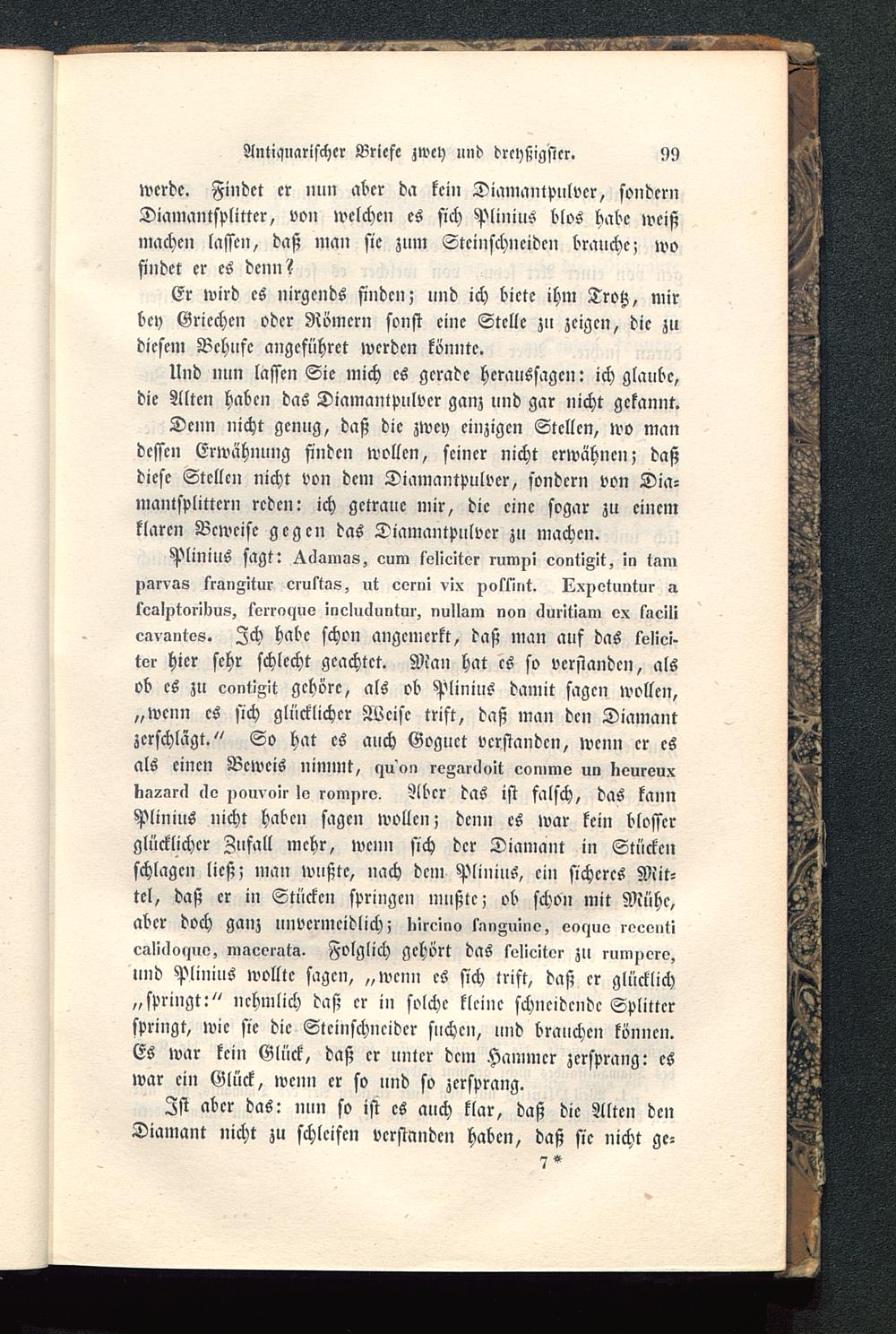 Plinius sagt: ^llanias, cum feüeiter rumpi contiAlt, !n tam^grvas sranAitur crustas, ut cerni vix pollirit. I^xpotuntur atealptorilms, tvn'<i«in<Z inclulluntur, nullam non duntism ex laeüicavantos. Ich habe schon angemerkt, daß man auf das tvlic!-tor hier sehr schlecht geachtet. Man hat es so verstanden, alsob es zu enntlglt gehöre, als ob Plinius damit sagen wollen,„wenn es sich glücklicher Weise trift, daß man den Diamantzerschlägt." So hat es auch Goguct verstanden, wenn er esals einen Beweis nimmt, «juon reFiulloit eommo uo koureuxK.i2k>rl1 ilo pouvair lo rompro, Aber das ist falsch, das kannPlinius nicht haben sagen wollen; denn es war kein blosserglücklicher Zufall mehr, wenn sich der Diamant in Stückenschlagen ließ; man wußte, nach dem Plinius, ein sicheres Mit-tel, daß er in Stücken springen mußte; ob schon mit Mühe,aber doch ganz unvermeidlich; Iili-cmo s.inAuiiio, oo^uo i-oeonticali«lo«zno> maeeiaw. Folglich gehört das iolieiter zu rumj>cro,und Plinius wollte sagen, „wenn es sich trift, daß er glücklich„springt:" nehmlich daß er in solche kleine schneidende Splitterspringt, wie sie die Steinschneider suchen, und brauchen können.Es war kein Glück, daß er unter dem Hammer zersprang: eswar ein Glück, wenn er so und so zersprang.
