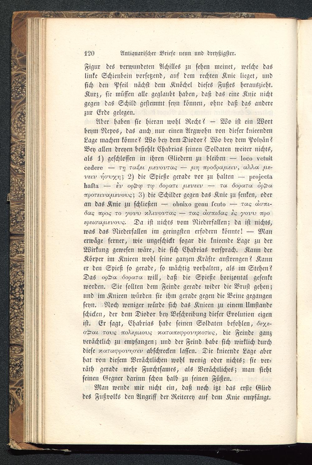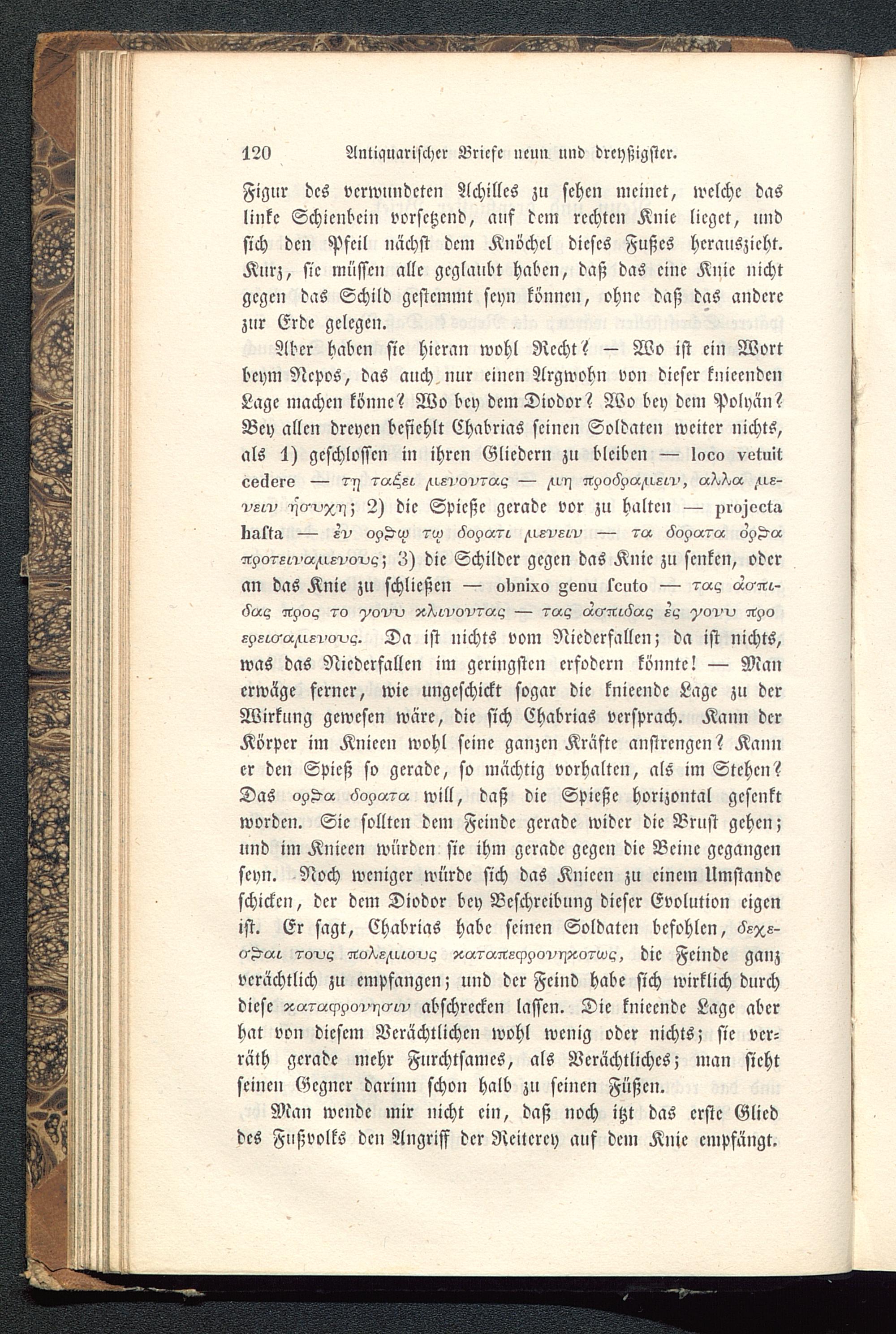 x^o-^^i^i.'?. Da ist nichts vom Niederfallen; da ist nichts,was das Niederfallen im geringsten crfodcrn könnte! — Manerwäge ferner, wie ungeschickt sogar die kniecnde Lage zu derWirkung gewesen wäre, die sich Chabrias versprach. Kann derKörper im Knieen wohl seine ganzen Kräfte anstrengen? Kanner den Spieß so gerade, so mächtig vorhalten, als im Stehen?Das 09^« 6oji«?-« will, daß die Spieße horizontal gesenktworden. Sie sollten dem Feinde gerade wider die Brust gehen;und im Knieen wurden sie ihm gerade gegen die Beine gegangenseyn. Noch weniger würde sich das Knieen zu einem Umständeschicke», der dem Diodor bey Beschreibung dieser Evolution eigenist. Er sagt, Ehabrias habe seinen Soldaten befohlen,ci^oii 501^ n5oX.x^>,ioi^ sc«7'«7cxcs?z>ov^xo7'(t>5, die Feinde ganzverächtlich zu empfangen; und der Feind habe sich wirklich durchdiese x«7-«cppoviio-tv abschrecken lassen. Die kniecnde Lage aberhat von diesem Verächtlichen wohl wenig oder nichts; sie ver-räth gerade mehr Furchtsames, als Verächtliches; man siehtseinen Gegner darinn schon halb zu seinen Füßen.