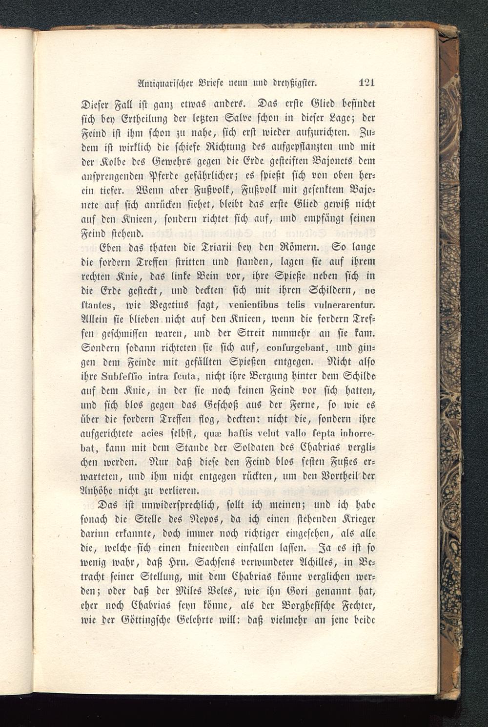 auf dem Knie, in der sie noch keinen Feind vor sich hatten,und sich blos gcgcn das Geschoß aus der Ferne, so wie esüber die fordern Treffen flog, deckten: nicht die, sondern ihreaufgerichtete aoies selbst, «zm»; listtis vvlut vsllo le^ta inkorre-dat, kann mit dem Stande der Soldaten des Ehabrias vergli-chen werden. Nur daß diese den Feind blos festen Fußes er-warteten, und ihm nicht entgegen rückten, um den Vortheil derAnhöhe nicht zu verlieren.