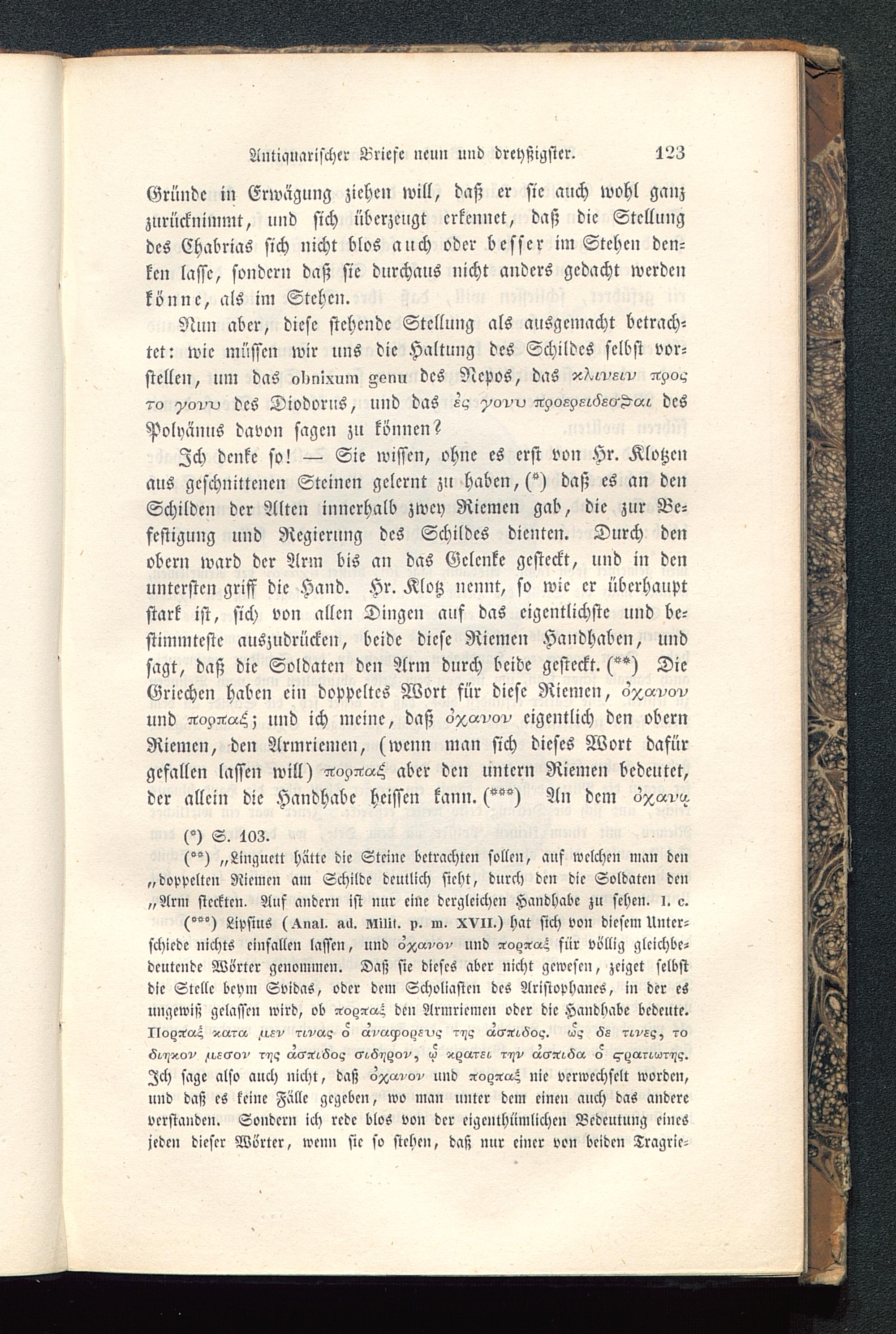 Ich denke so! — Sie wissen, ohne es erst von Hr. Klotzenaus geschnittenen Steinen gelernt zu haben, (") daß es an denSchilden der Alten innerhalb zwey Riemen gab, die zur Be-festigung und Regierung des Schildes dienten. Durch denobern ward der Arm bis an das Gelenke gesteckt, und in denuntersten griff die Hand. Hr. Klotz nennt, so wie er überhauptstark ist, sich von allen Dingen auf das eigentlichste und be-stimmteste auszudrücken, beide diese Riemen Handhaben, undsagt, daß die Soldaten den Arm durch beide gesteckt. DieGriechen haben ein doppeltes Wort für diese Riemen, o'x«vovund ?ropir«^; und ich meine, daß ox,«vov eigentlich den obernRiemen, den Armriemen, (wenn man sich dieses Wort dafürgefallen lassen will) 71097^ aber den untern Riemen bedeutet,der allein die Handhabe hcissen kann. (*"°) An dem ox-n'u,