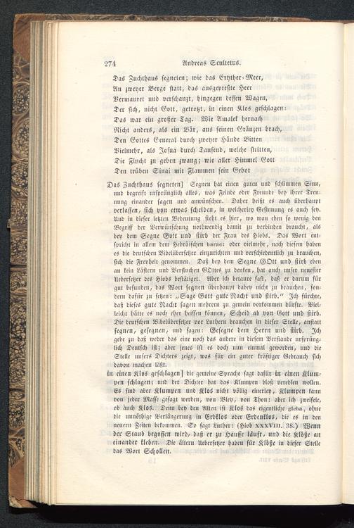 Das Zuchthaus segneten^ Segnen hat eine» guten und schlimmen Sinn,und begreift ursprünglich alles, was Feinde oder Freunde bey ihrer Tren-nung einander sagen und anwünschrn. Daher heißt es auch überhauptperlassen, sich von etwas scheide», in welcherlei? Gesinnung es auch scv.Und in dieser letzten Bedeutung steht es hier, wo man eben so wenig denBegriff der Verwünschung nothwendig damit zu verbinden braucht, alsbey dem Segne Gott nnd stirb der Frau des Hiebs. Das Wort ent-spricht in allem dem Hcbrciischm ii»r->e: oder vielmehr, nach diesem habenes die deutschen Bibelübersctzcr einzurichten nnd verschiedentlich zu brauchen,sich die Freyheit genommen. Daß bcv dem Segne GOtt und stirb ebena» kein Lastein und Verfluchen GOltcs zu denke», hat auch unser neuesterUcbcrsetzcr des Hiobs bestätiget. Aber ich bctanre fast, daß er darum fürgut befunden, das Wort segnen überhaupt dabev nicht zu brauchen, son-der» dafür zu setzen: „Sage Gott gute Nacht und stirb." Ich fürchte,daß dieses gute Nacht sagen niehrcr» zu gemein vorkommen dürfte. Viel-leicht hätte es »och eher heisst» könne», Scheid ab von Gott und stirb.Die deutsche» Bibclübersrtzcr vor Luther» brauche» i» dieser Stelle, anstattsegne»/ gesegnet!/ n»d sage«: Gcsegne dem Herrn und stirb. Ichgebe zu daß weder das eine »och das andere in diesem Verstände ursprüng-lich Deutsch ist; aber jenes ist es doch »uu cimiial geworde«, und dieStelle uuscrs Dichters zeigt, was für ei» g«tcr kräftiger Gebrauch sichdavon machen läßt.
