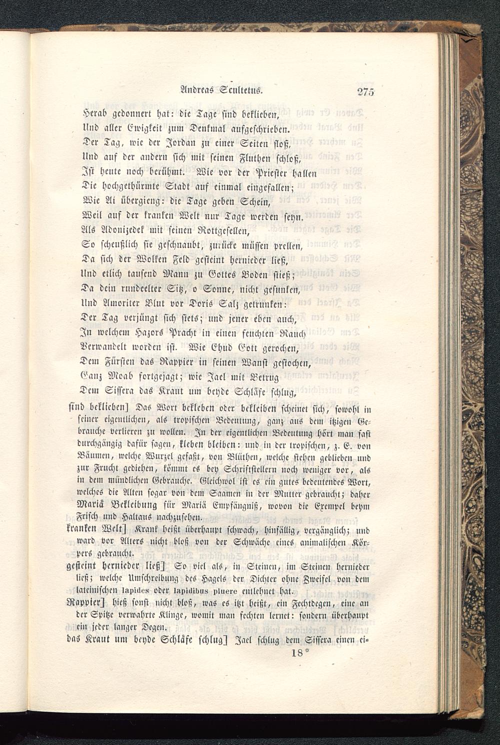 Herab gedonnert hat: dic Tage sind bcklicbcir,Und aller Ewigkeit zuni Denkmal aufgcschricbcu.Der Tag. wic der Jordan zn cincr Scitcn stoß,lind auf dcr andern sich mit seinen Fluthen schloß,Ist heute noch berühmt. Wie vor dcr Priester hallenDie hochgethürmtc Stadt auf einmal eingefallen;Wic Ai nbcrgicng: die Tage geben Schein,Weil auf der kranken Welt nur Tage werden seyn.Als Adonijcdck mit seinen Rottgcscllcn,So scheußlich sie geschnaubt, zurücke müsse» prcllcn,Da sich dcr Wolkcn Feld gcstcint hernieder ließ,Und etlich tanscnd Mann zu Gottes Boden stieß;Da dein rmidceltcr Sitz, o Sonne, nicht gcsnnkcn,Und Amoritcr Blut vor Doris Salz getrunken:Dcr Tag verjüngt sich stets; und jener cbcn auch,In welchem Hazors Pracht in einen feuchten RauchVerwandelt worden ist. Wie Ehud Gott gerochen,Dcm Fürsten das Rappier in feinen Wanst gestochen,Ganz Moab fortgejagt; wic Jacl mit BetrugDcm Sisscra das Kraut um beyde Schlaft schlug,