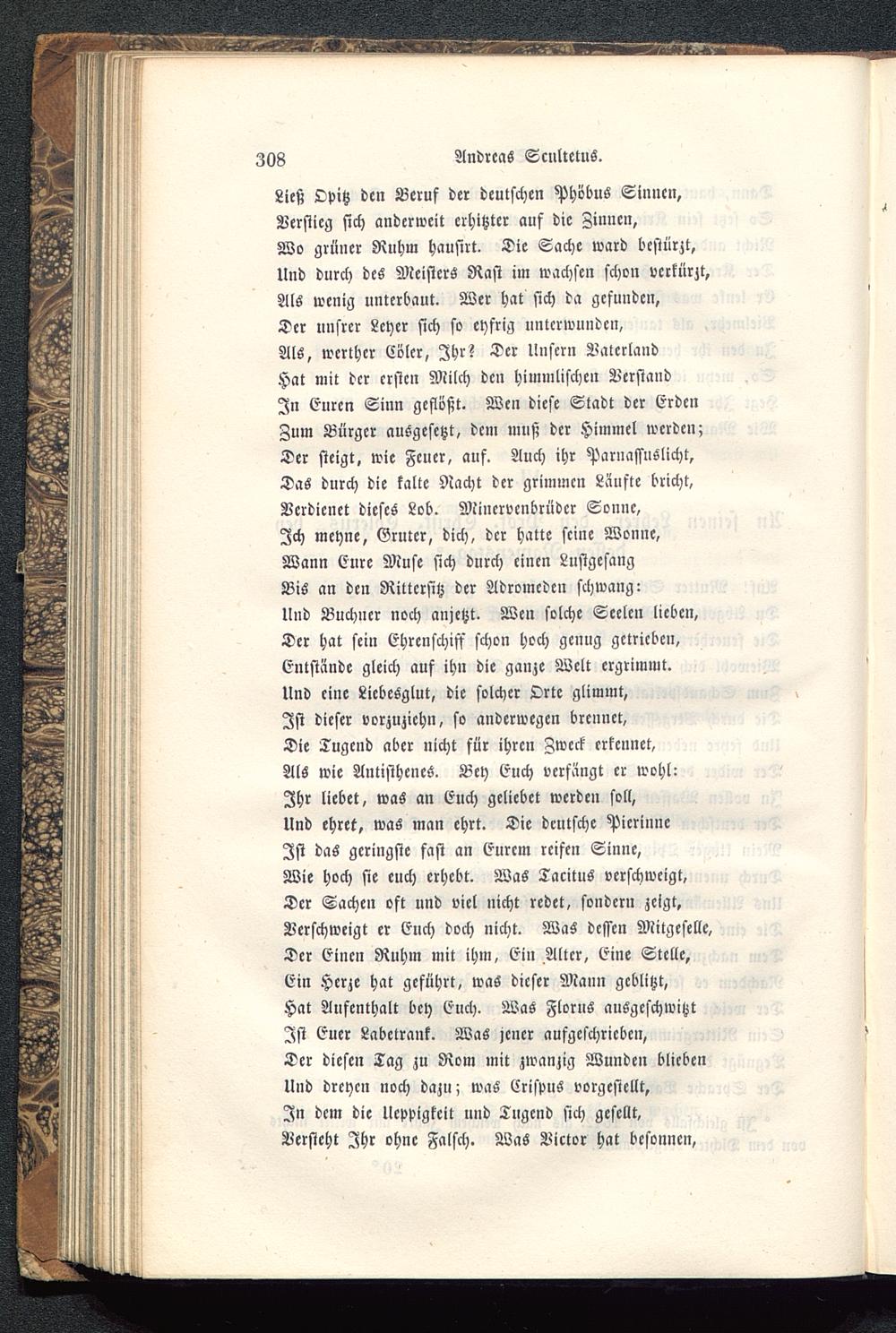 Ließ Opitz den Beruf der deutschen Phöbus Sinnen,Verstieg sich anderweit erhitzter auf die Zinnen,Wo grüner Ruhm hausirt. Die Sache ward bestürzt,Und durch des Meisters Rast im wachsen schon verkürzt,Als wenig unterbaut. Wer hat sich da gefunden,Der unsrer Lcyer sich so eyfrig untcrwundcn,Als, werther Cölcr, Ihr? Der Unsern VaterlandHat mit der ersten Milch den himmlischen VerstandIn Euren Sinn geflößt. Wen diese Stadt der Erde »Zum Bürger ausgesetzt, dem muß der Himmel werden;Der steigt, wie Feuer, auf. Auch ihr ParnassuSlicht,Das durch die kalte Nacht der grimmen Laufte bricht,Verdienet dieses Lob. Mincrvenbrüdcr Sonne,Ich meyne, Gruter, dich, der hatte seine Wonne,Wann Eure Muse sich durch einen LustgesangBis an den Rittcrfitz der Adromcden schwang:Und Buchner noch anjetzt. Wen solche Seelen lieben,Der hat sein Ehrenschiff schon hoch genug getrieben,Entstände gleich auf ihn die ganze Welt ergrimmt.Und eine LiebeSglut, die solcher Orte glimmt,Ist dieser vorzuzichn, so anderwegen brennet,Die Tugend aber nicht für ihren Zweck erkennet,Als wie AntistheneS . Bey Euch verfängt er wohl:Ihr liebet, was an Euch geliebet werden soll,Und ehret, was man ehrt. Die deutsche PicrinncIst das geringste fast an Eurem reifen Sinne,Wie hoch sie euch erhebt. Was Tacitus verschweigt,Der Sachen oft und viel nicht redet, sondern zeigt,Verschweigt er Euch doch nicht. Was dessen Mitgesellc,Der Einen Ruhm mit ihm, Ein Alter, Eine Stelle,Ein Herze hat geführt, was dieser Mann geblitzt,Hat Aufenthalt bey Euch. Was Florus ausgeschwitztIst Euer Labetrank. Was jener aufgeschrieben,Der diesen Tag zu Rom mit zwanzig Wunden bliebenUnd dreyen noch dazu; was LrispuS vorgestellt,In dem die lleppigkeit und Tugend sich gesellt,Versteht Ihr ohne Falsch. Was Victor hat besonnen,