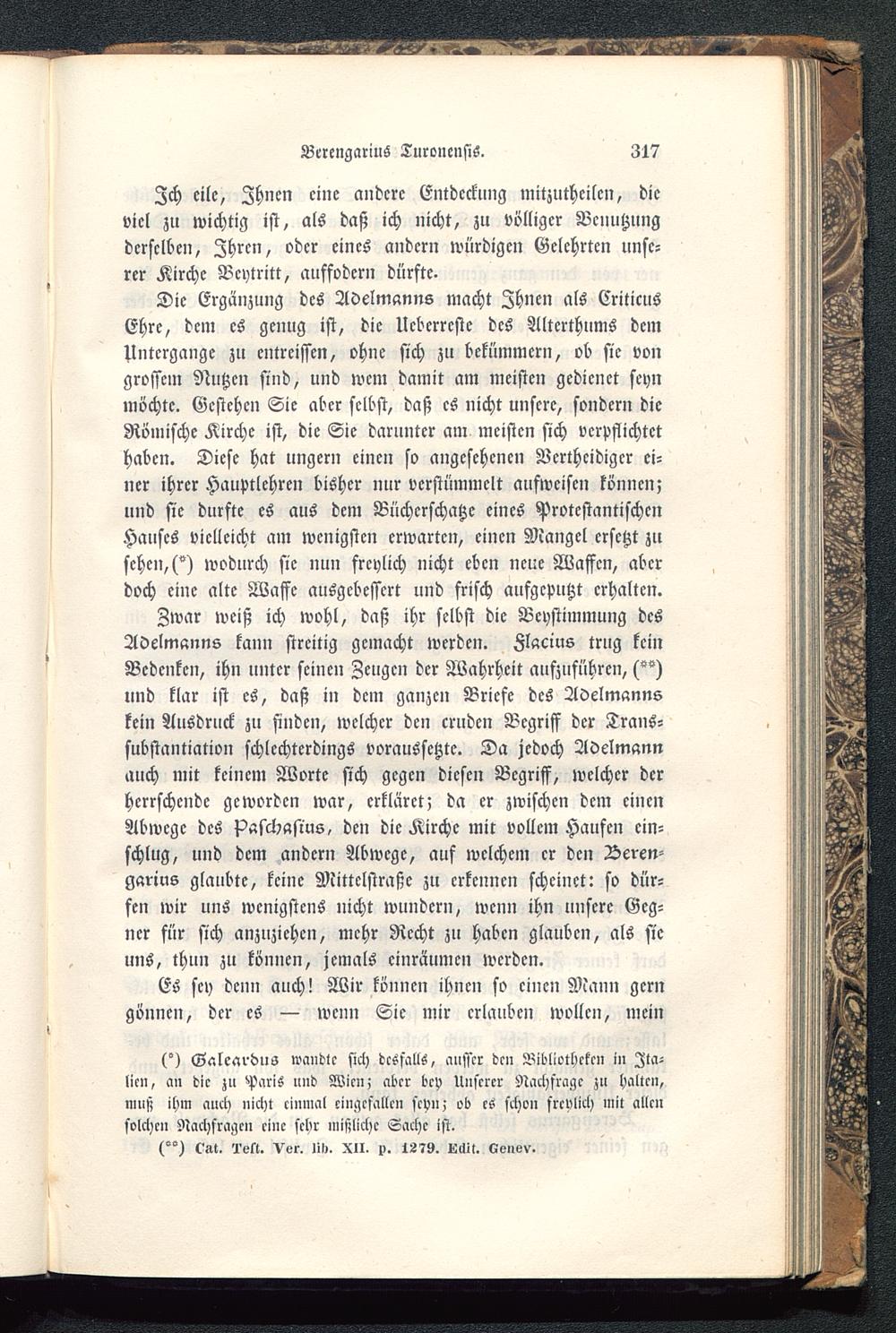 Zwar weiß ich wohl, daß ihr selbst die Beystimmung desAdelmanns kann streitig gemacht werden. Flacius trug keinBedenken, ihn unter seinen Zeugen der Wahrheit aufzuführen,und klar ist es, daß in dem ganzen Briefe des Adelmannskein Ausdruck zu finden, welcher den cruden Begriff der Trans-substantiation schlechterdings voraussetzte. Da jedoch Adelmannauch mit keinem Worte sich gegen diesen Begriff, welcher derherrschende geworden war, erkläret; da er zwischen dem einenAbwege des Paschasius, den die Kirche mir vollem Haufen ein-schlug, und dem andern Abwege, auf welchem er den Deren-garms glaubte, keine Mittelstraße zu erkennen scheinet: so dür-fen wir uns wenigstens nicht wundern, wenn ihn unsere Geg-ner für sich anzuziehen, mehr Recht zu haben glauben, als sieuns, thun zu können, jemals einräumen werden.