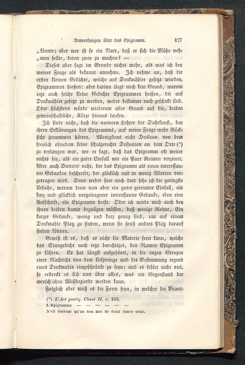 Zch finde nicht, daß die nenrern Lehrer der Dichtkunst, beyihren Erklärungen des Epigramms, auf meine Frage mehr Rück-sicht genommen hätten. Wenigstens nicht Doileau, von demfreylich ohnedem keine schulgcrcchte Definition an dem Orte(")zu verlangen war, wo er sagt, daß das Epigramm oft weiternichts sey, als ein guter Einsall mit ein Paar Reimen verzieret.Aber auch Nktceux nicht, der das Epigramm als einen interessan-ten Gedanken beschreibt, der glücklich und in wenig Worten vor-getragen wird. Denn weder hier noch dort sehe ich die geringsteUrsache, warum denn nun aber ein guter gereimter Einfall, einkurz und glücklich vorgetragener interessanter Gedanke, eben eineAufschrift, ein Epigramm heißt. Oder ich werde mich auch beyihnen beiden damit begnügen müssen, daß wenige Reime, Einkurzer Gedanke, wenig und kurz genug sind, um auf einemDenkmahle Platz zu finden, wenn sie sonst anders Platz darauffinden können.