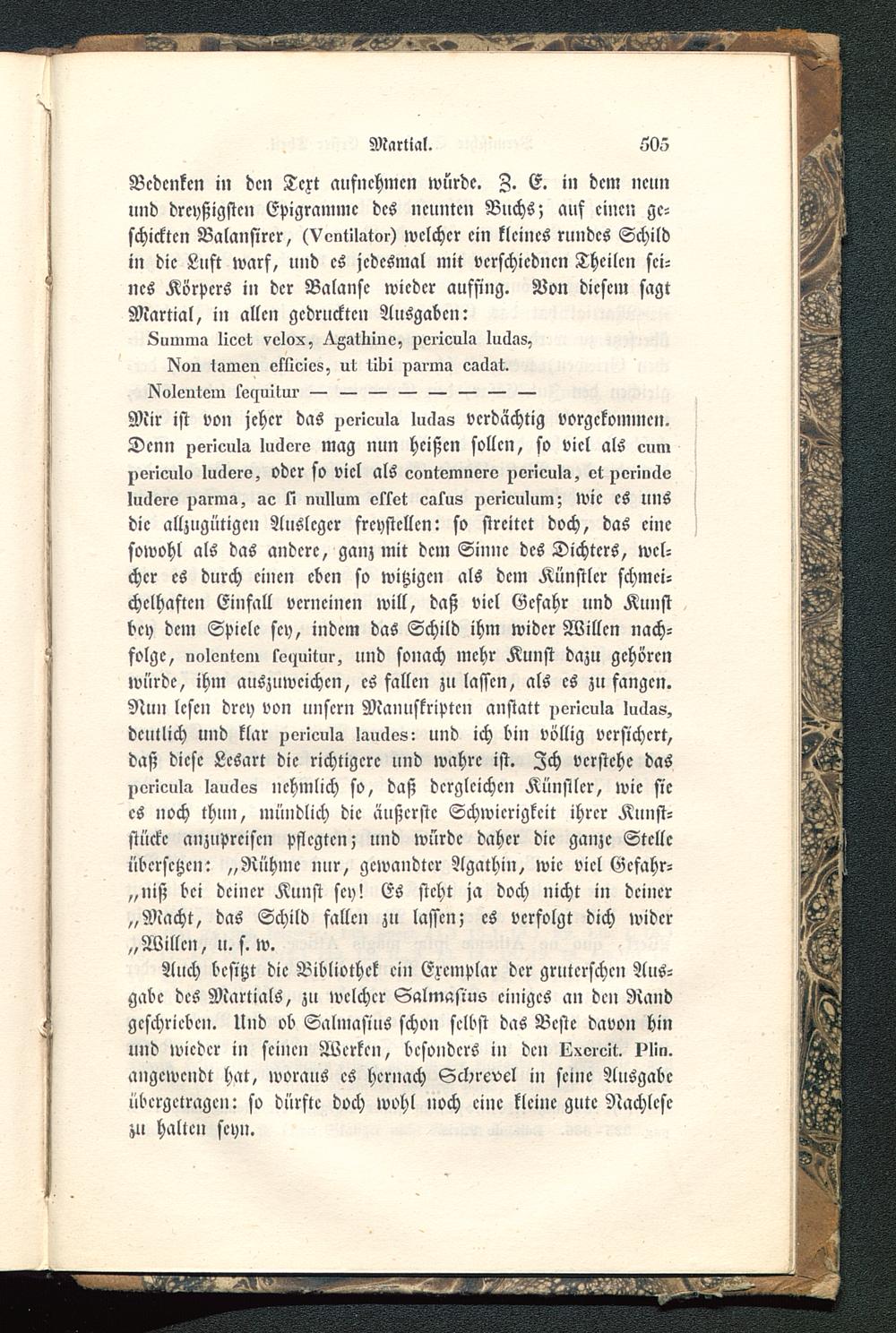Mir ist von jeher das poricula luclas verdächtig vorgekommen.Denn perieula luclvriz mag nun heißen sollen, so viel als eumpericulo lucloro, oder so viel als cootomnorv ^or'ieula, ot porioclelullere parma, ac H nnllum oskot catus porieulum; Wie es unsdie allzugütigen Ausleger freystcllcn: so streitet doch, das einesowohl als das andere, ganz mit dem Sinne des Dichters, wel-cher es durch einen eben so witzigen als dem Künstler schmei-chelhaften Einfall verneinen will, daß viel Gefahr und Kunstbey dem Spiele sey, indem das Schild ihm wider Willen nach-folge, nolc-litom le«iu!tui-, und sonach mehr Kunst dazu gehörenwürde, ihm auszuweichen, es fallen zu lassen, als es zu fangen.Nun lesen drey von unsern Manuskripten anstatt perleula luäas,deutlich und klar pcrleula lauäos: und ich bin völlig versichert,daß diese Lesart die richtigere und wahre ist. Ich verstehe dasporlcula laucles nehmlich so, daß dergleichen Künstler, wie siecs noch thun, mündlich die äußerste Schwierigkeit ihrer Kunst-stücke anzupreisen pflegten; und würde daher die ganze Stelleübersetzen: „Rühme nur, gewandter Agathin, wie viel Gcfahr-„niß bei deiner Kunst sey! Es steht ja doch nicht in deiner„Macht, das Schild fallen zu lassen; cs verfolgt dich wider„Willen, u. f. w.